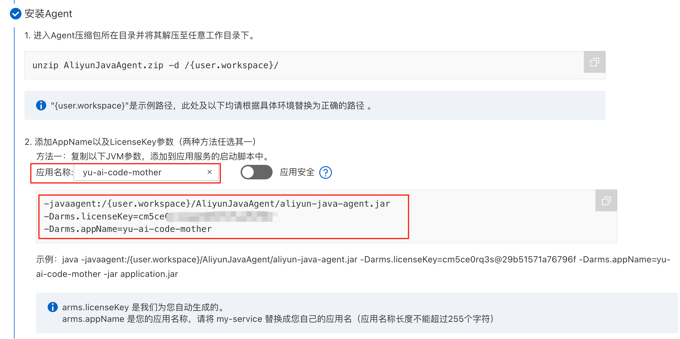 复制启动命令,注意替换目录路径和应用名称。你也可以选择开启应用安全功能,它能够提供