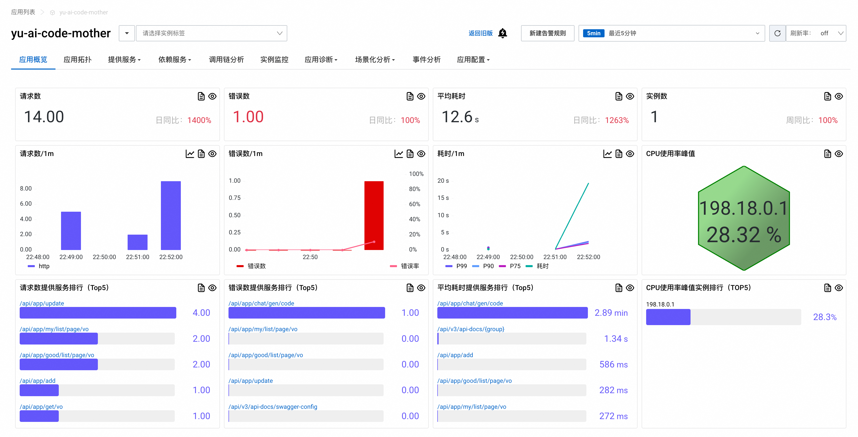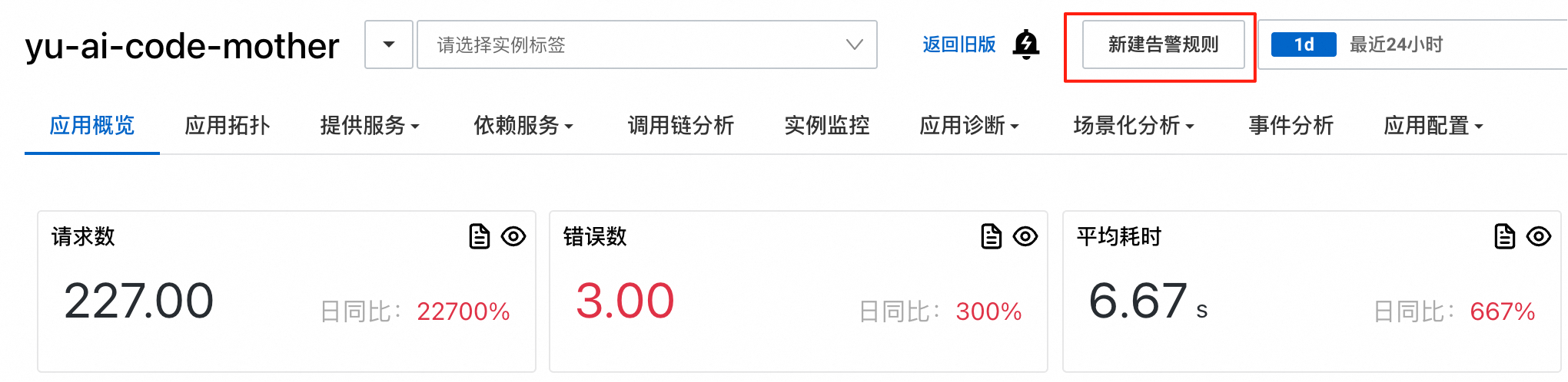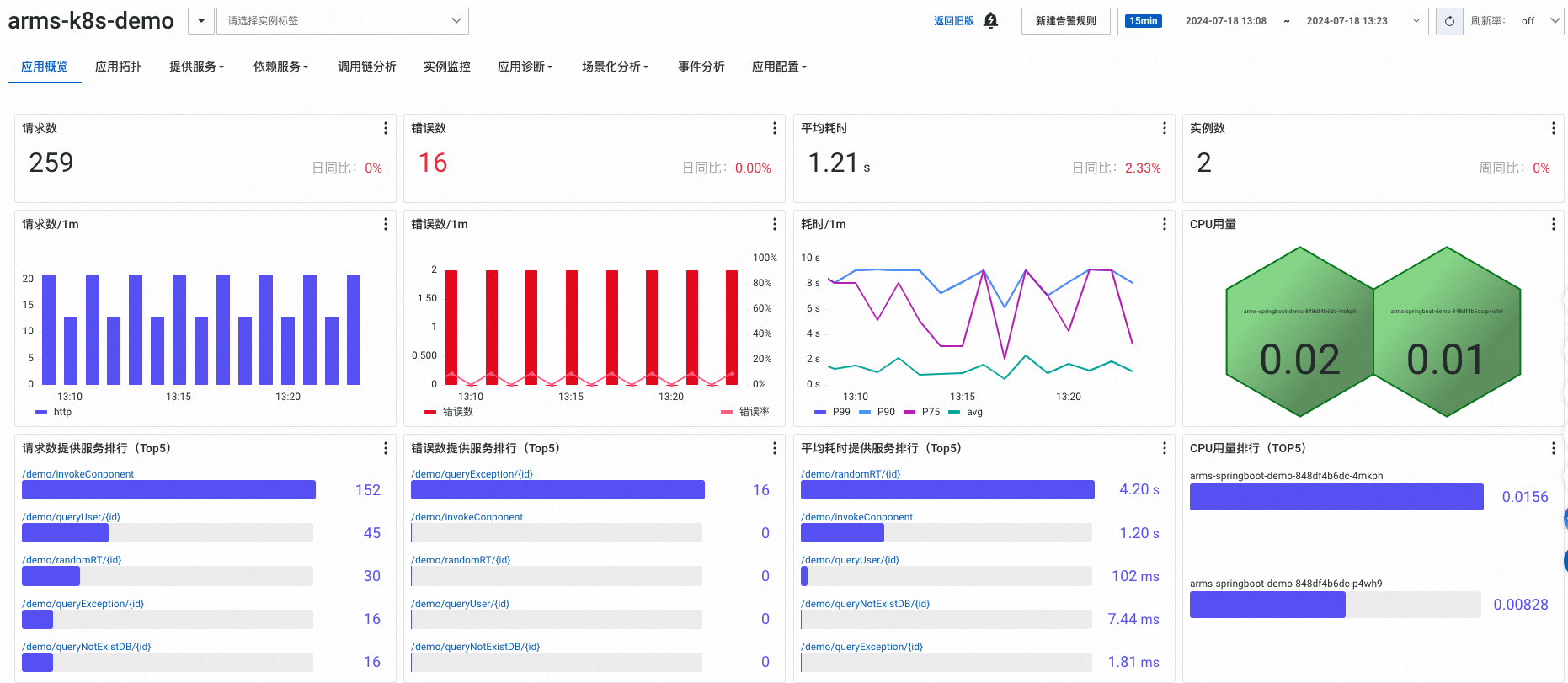 在这个页面可以看到应用的核心性能指标,包括请求数、响应时间、错误数等关键数据。