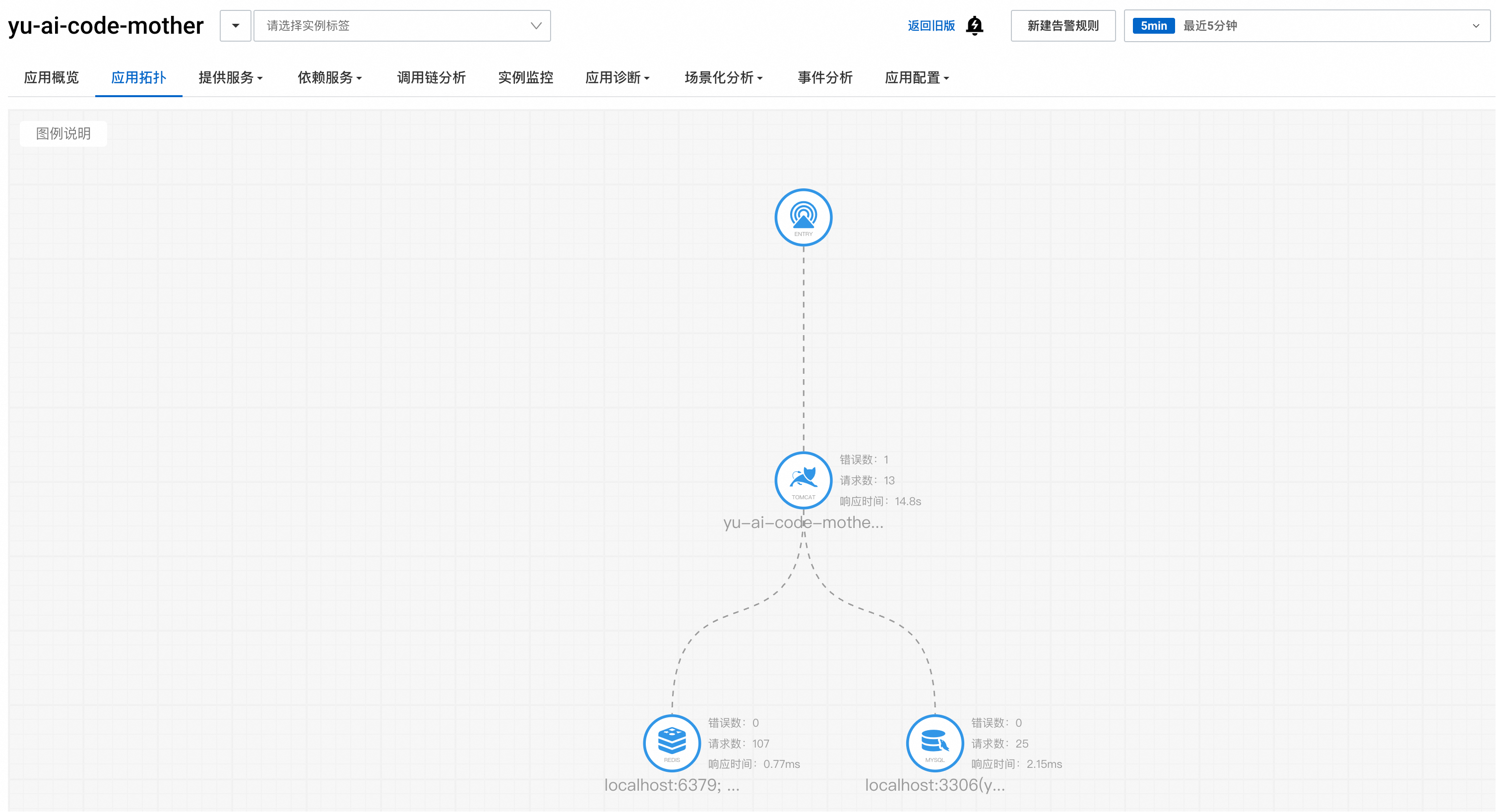 应用拓扑页面展示了项目的依赖关系图,可以清晰地看到应用和各种中间件的连接情况: