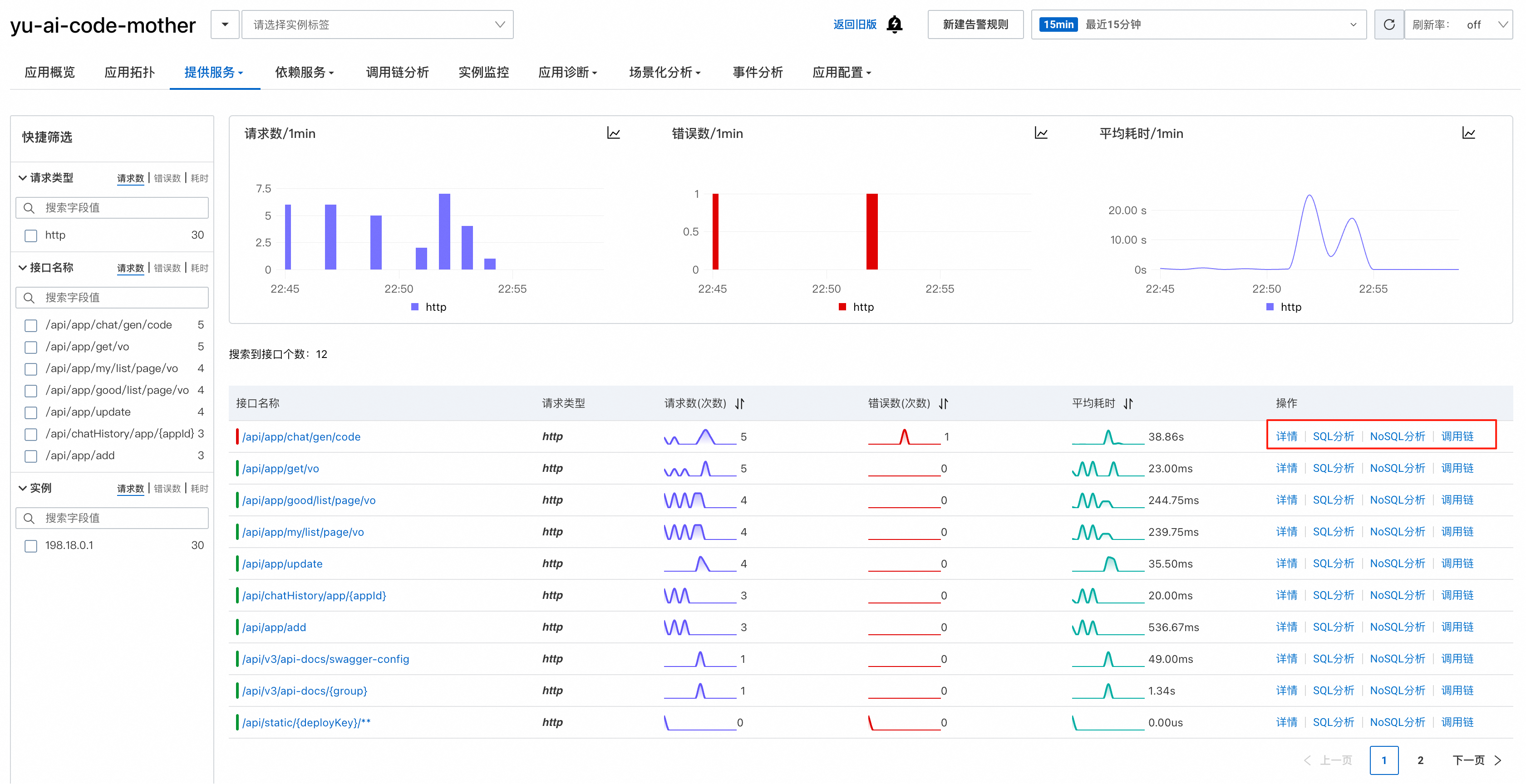 提供服务页面能够统一展示所有接口的调用情况,包括请求量、错误数、平均耗时等核心指标: