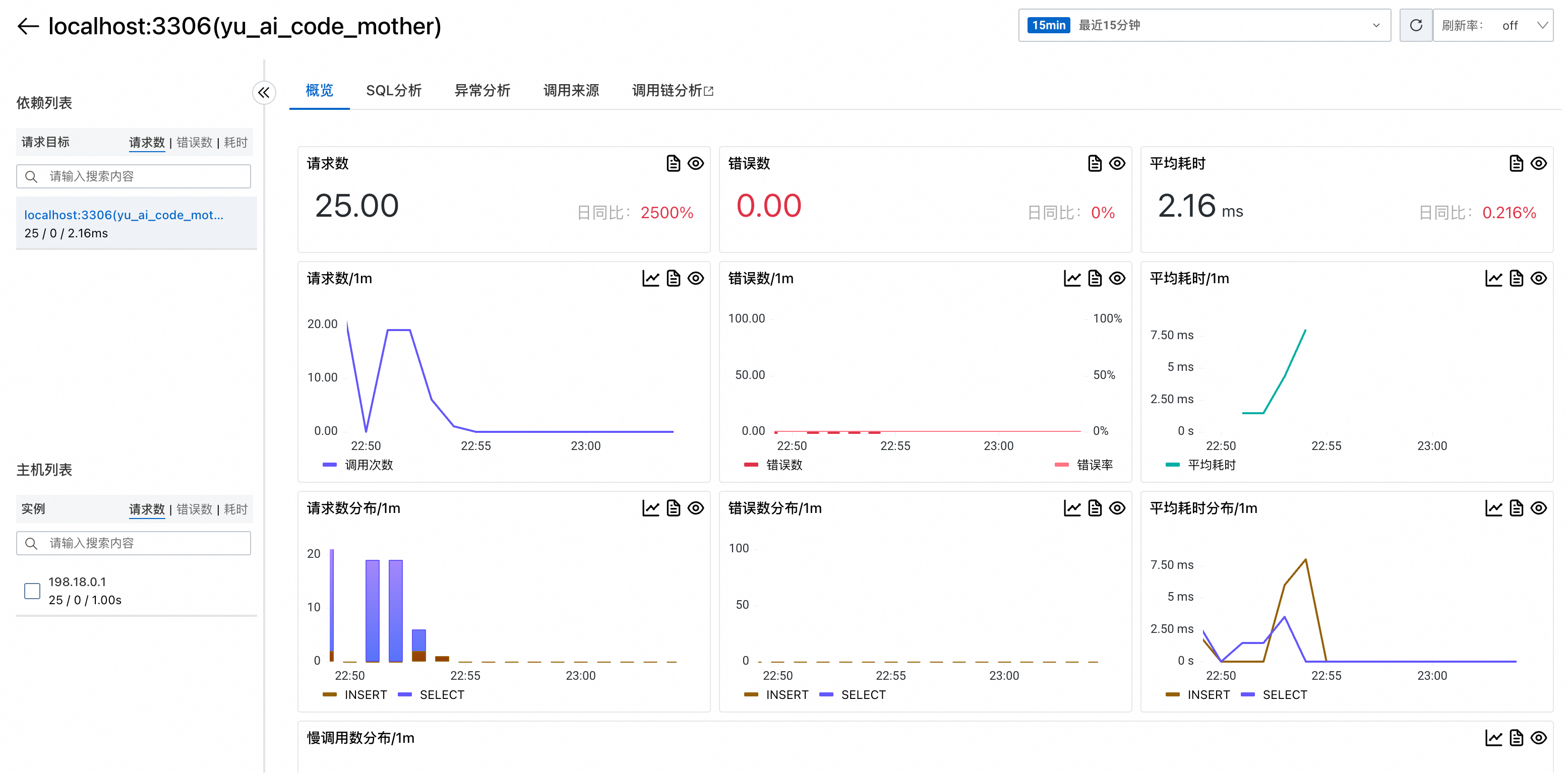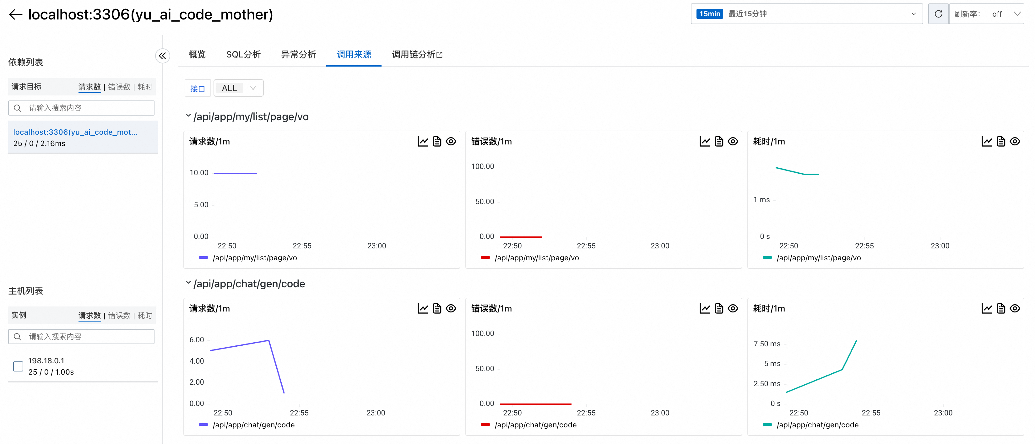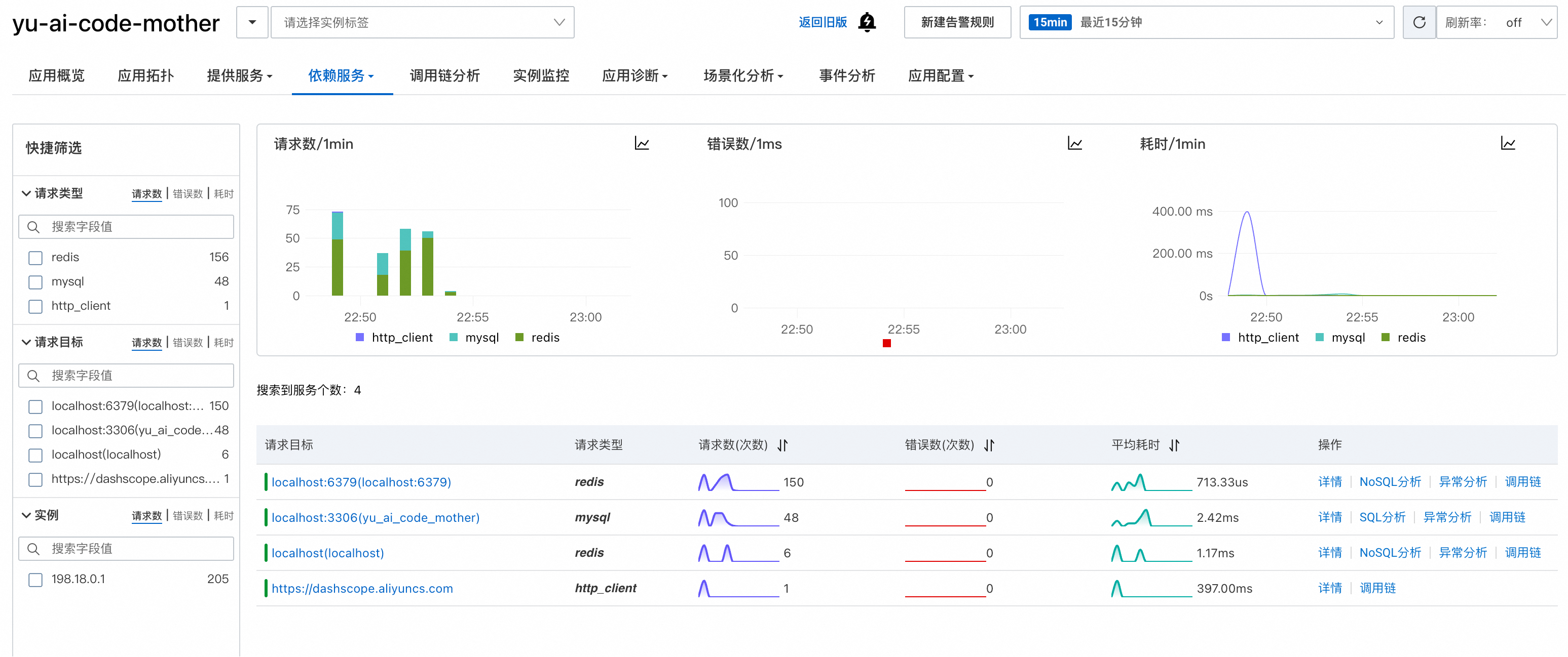 依赖服务页面专门监控应用对外部服务的调用情况,比如数据库、缓存等: