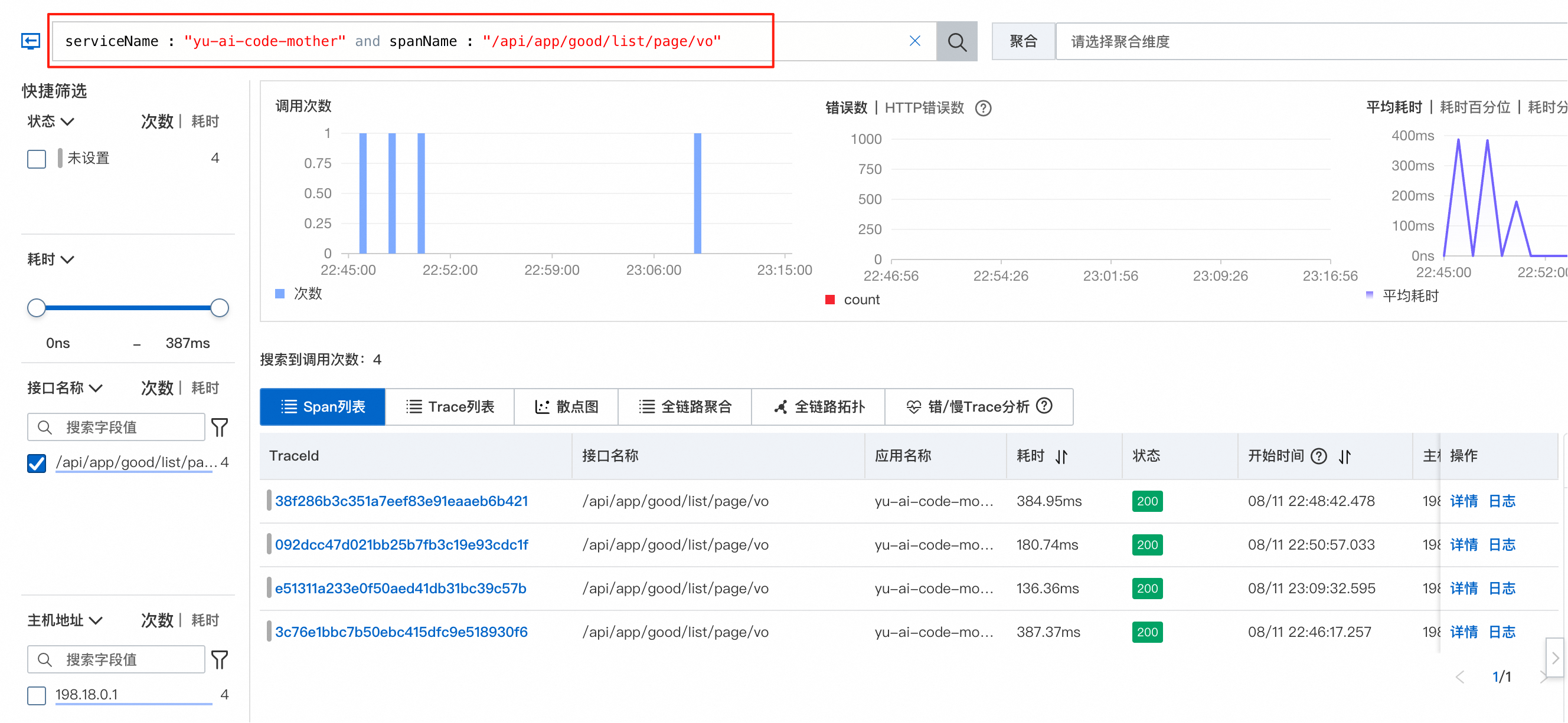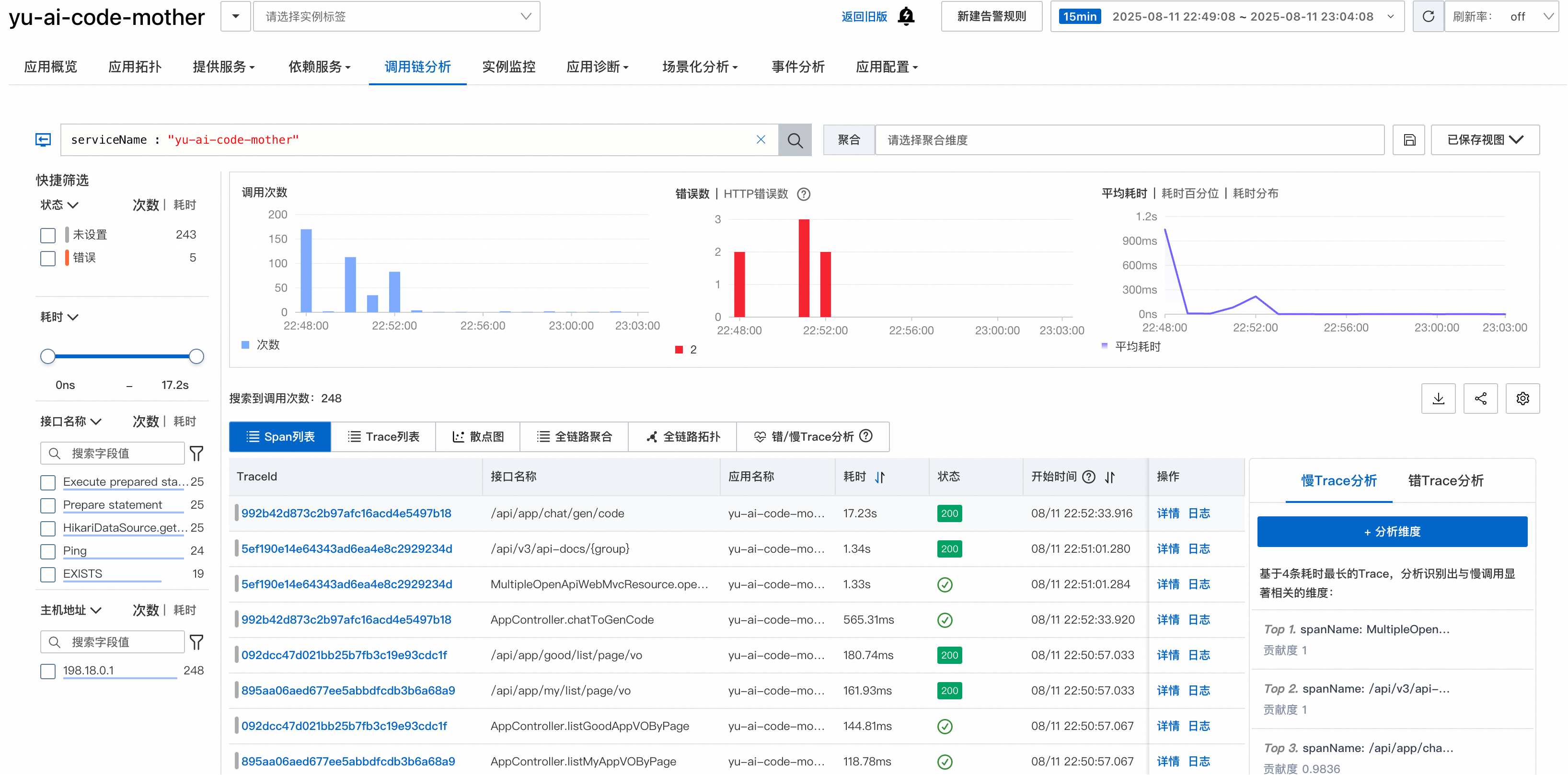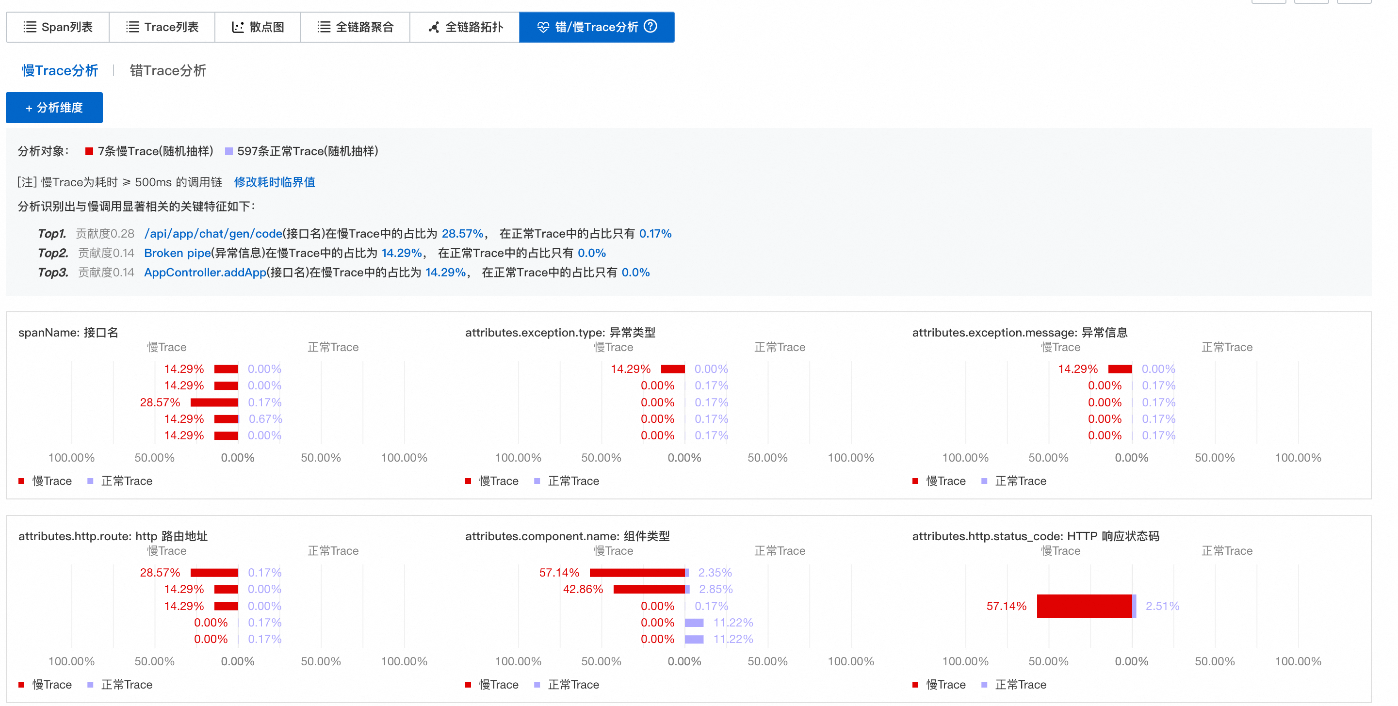 其中,错误 / 慢 Trace 分析功能特别实用,能够一秒定位到性能瓶颈: