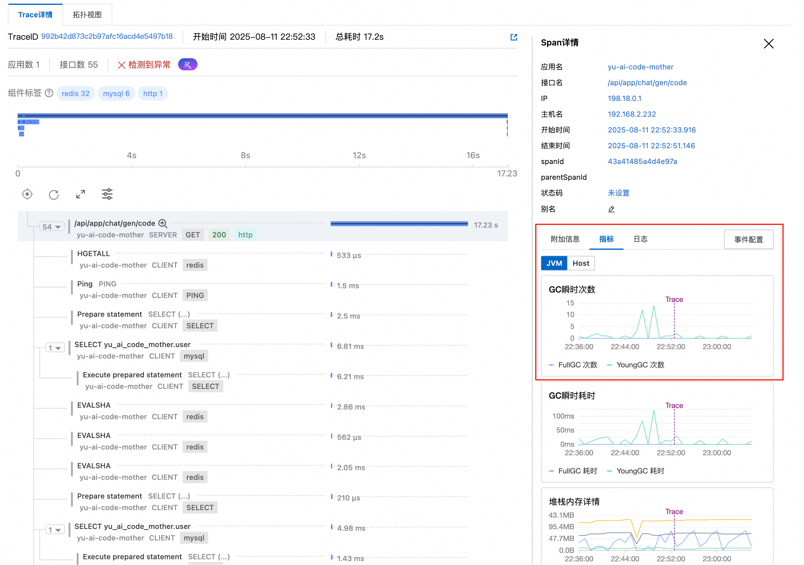 点击具体的调用记录,在 Trace 详情页面可以看到请求经过的每个环节和对应的耗时,右侧还能显示当时的 JVM 状态: