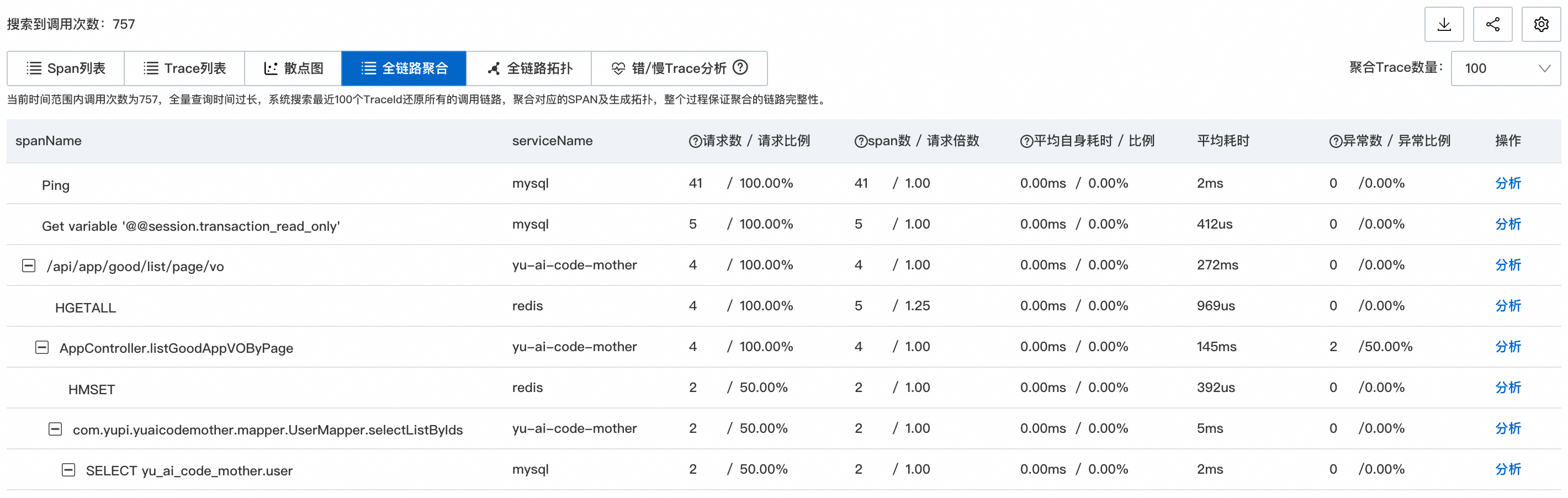 在全链路聚合页面可以清晰地看到树形的调用结构: