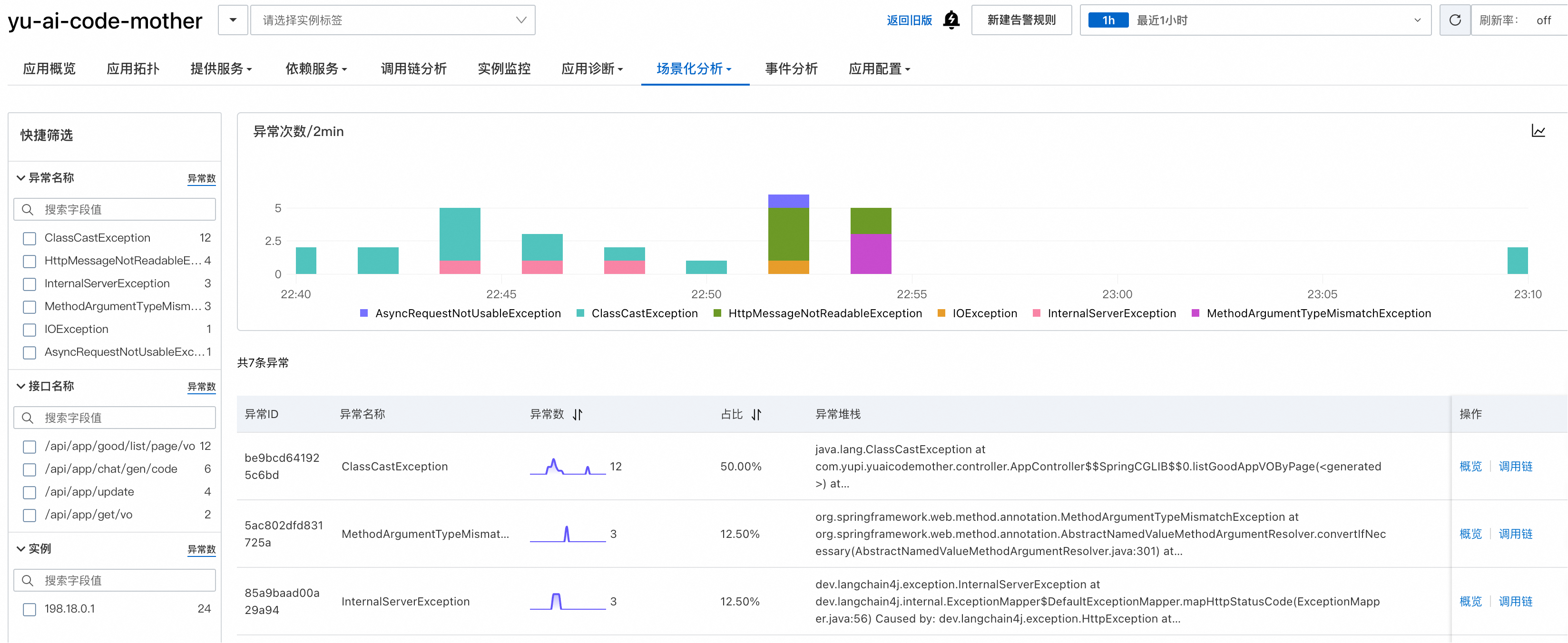 还提供了异常分析功能,可以帮助快速定位和解决应用中的异常问题: