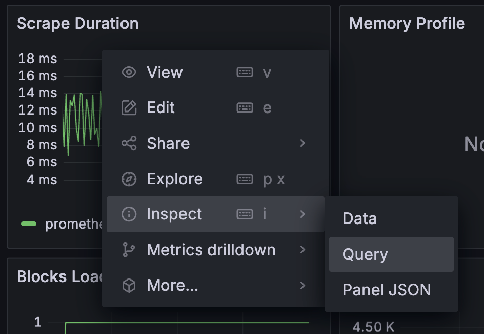 每个 Panel 都可以查看具体的数据、状态和查询语句: