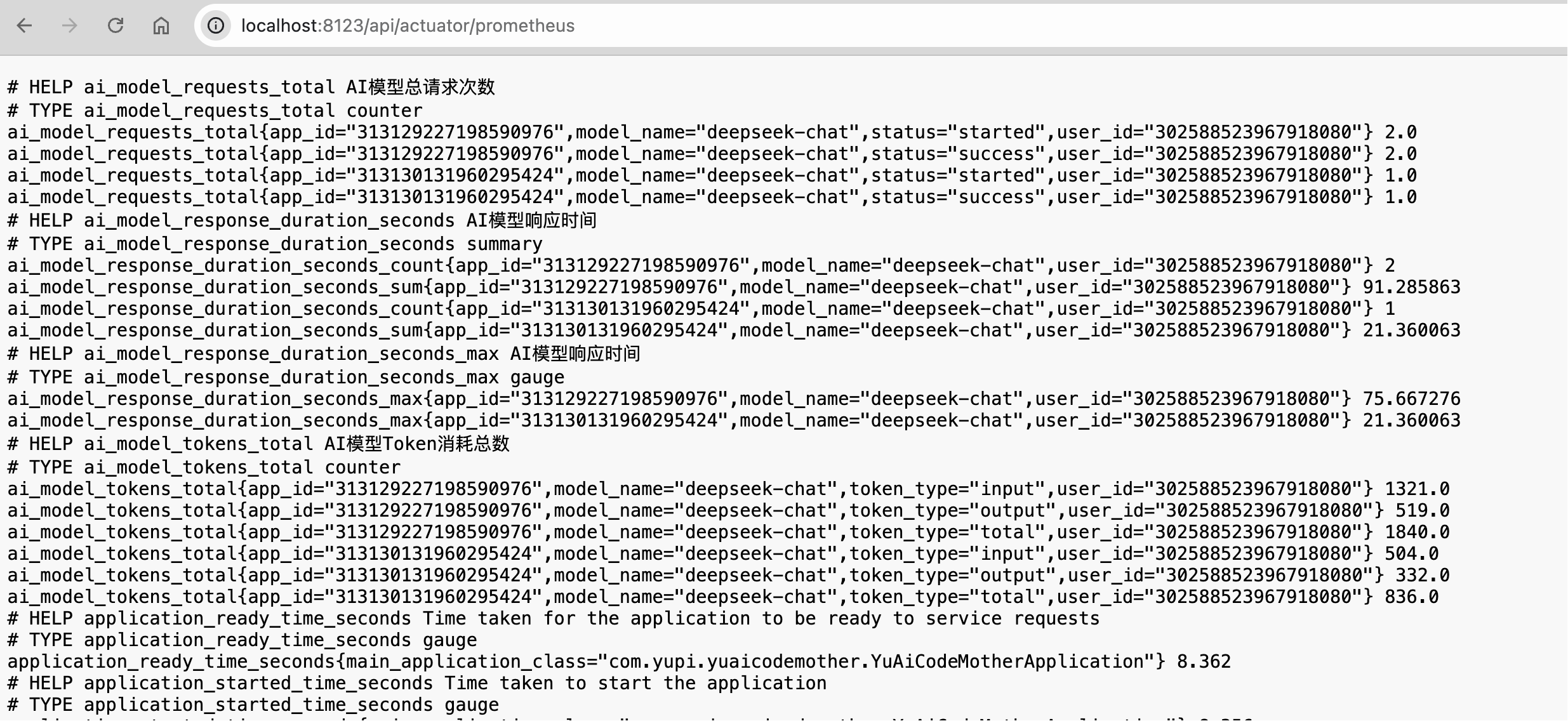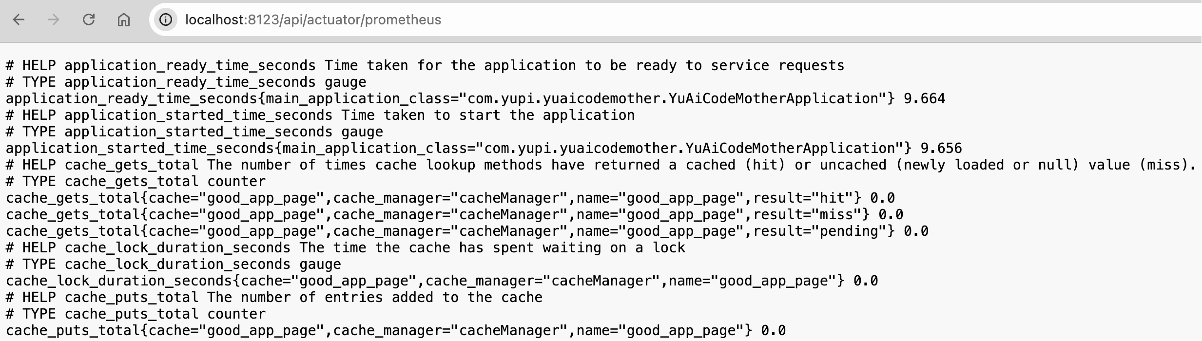 重启项目后,可以访问端点验证配置。比如 Prometheus 指标端点:http://localhost:8123/api/actuator/prometheus,可以看到 Spring Boot 默认提供的各种系统指标。