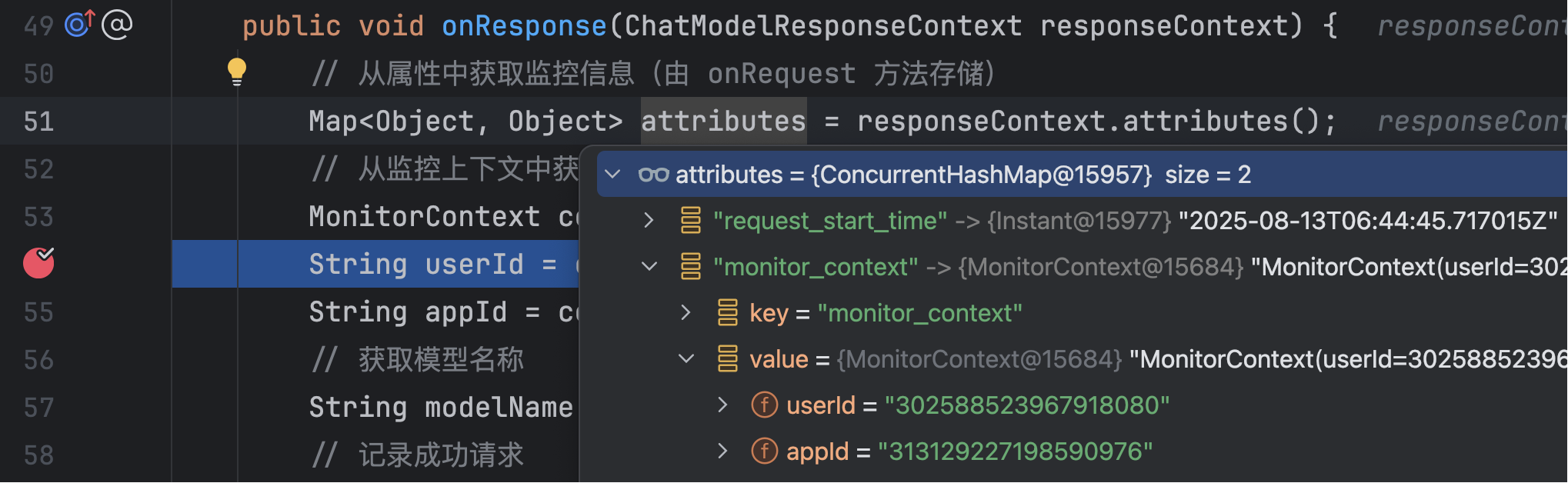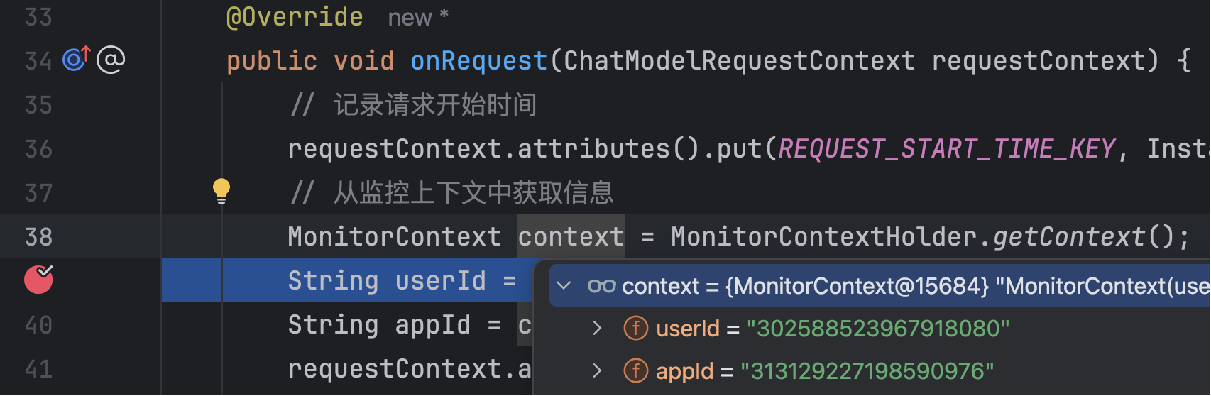 由于需要在监听器中获取业务维度信息(比如 appId、userId),我们可以通过 ThreadLocal 来传递这些参数。