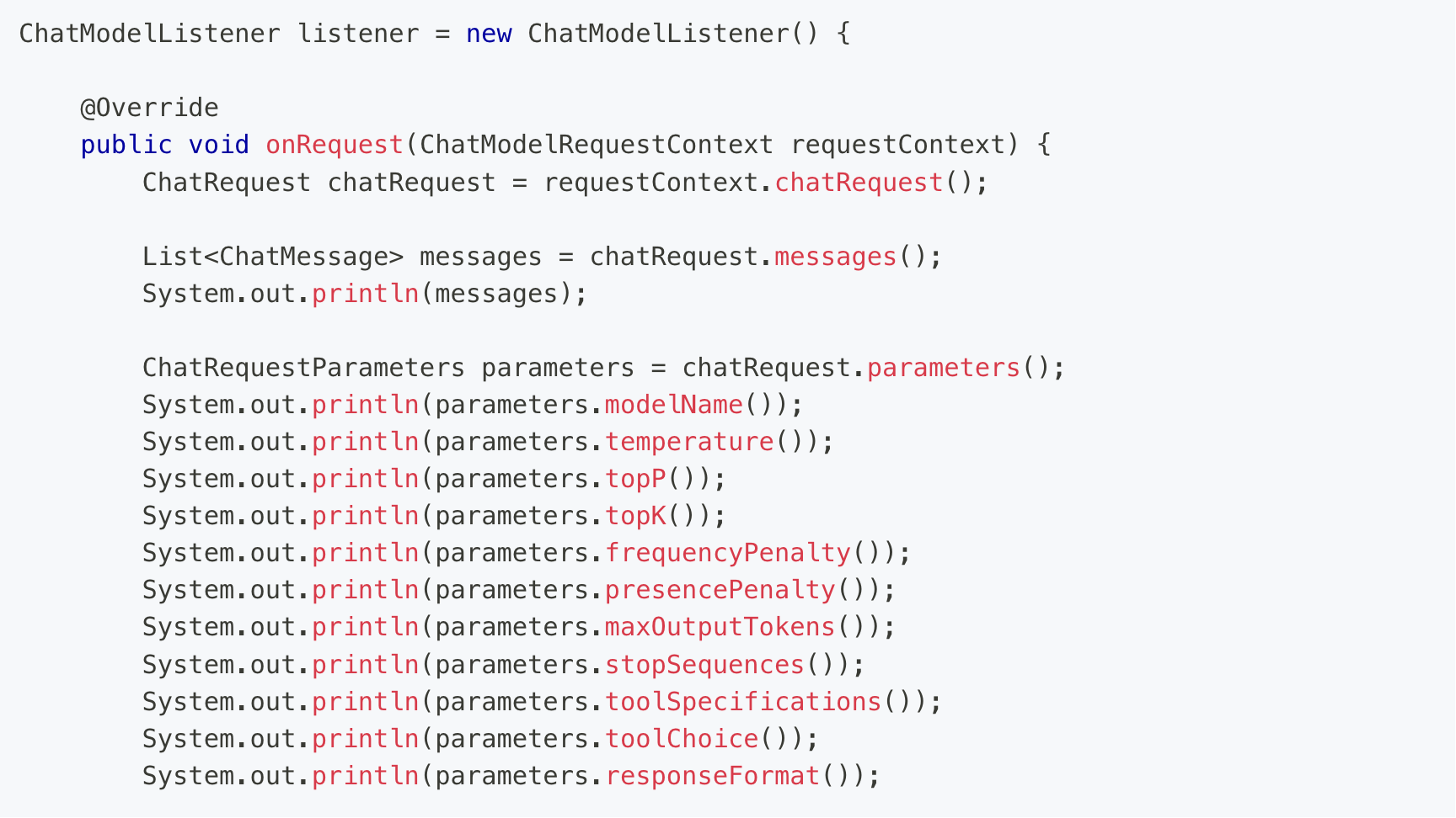 编写 LangChain4j 监听器来触发指标收集,这是整个监控体系的核心。下面列举监听 AI 请求和响应的代码: