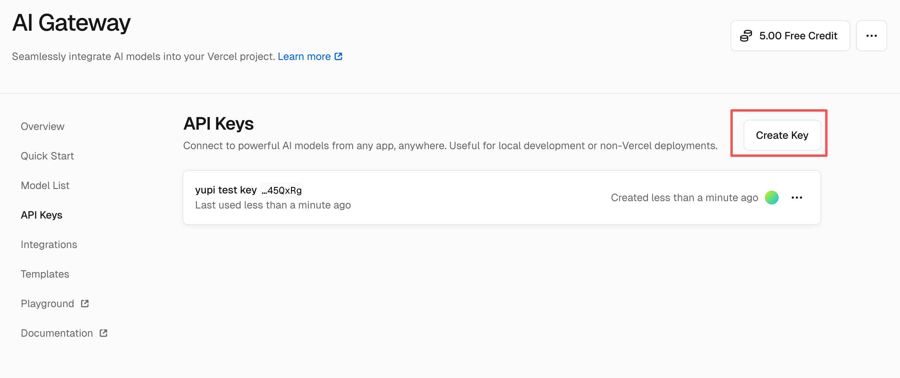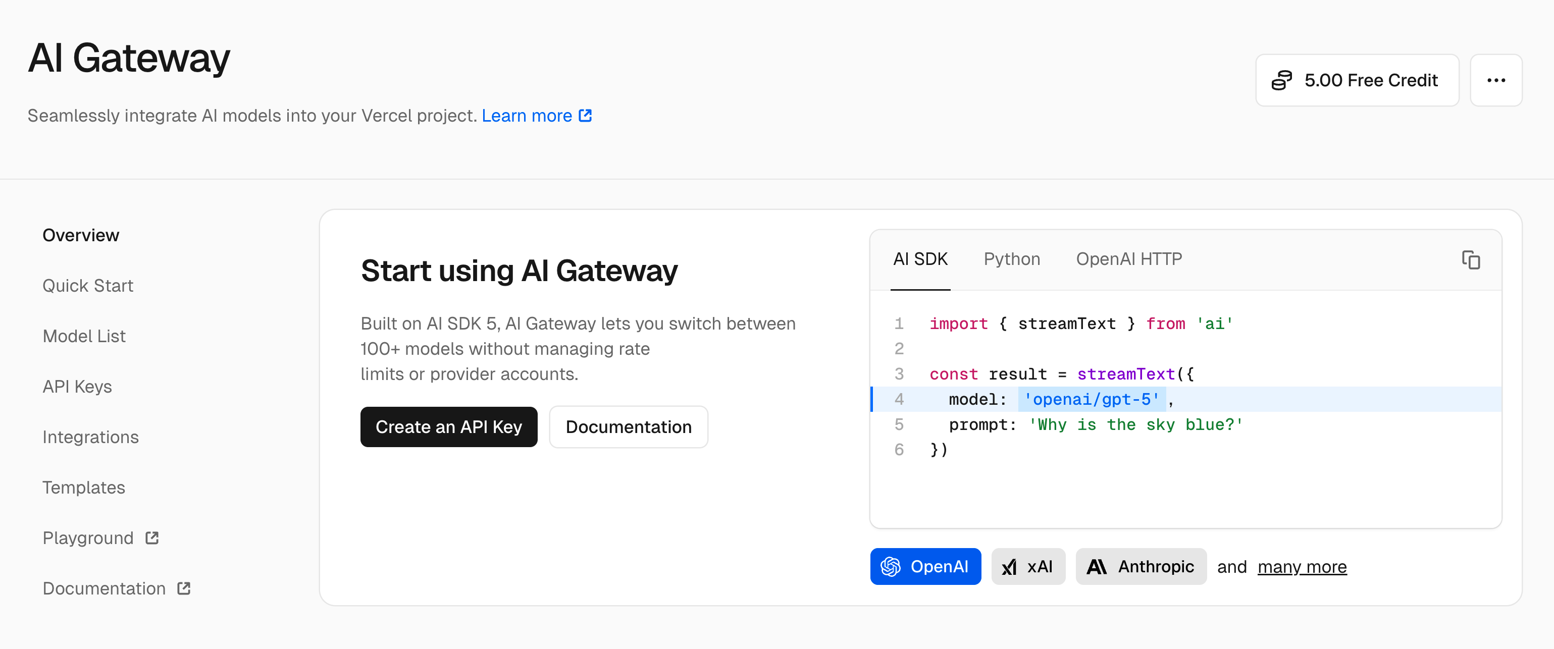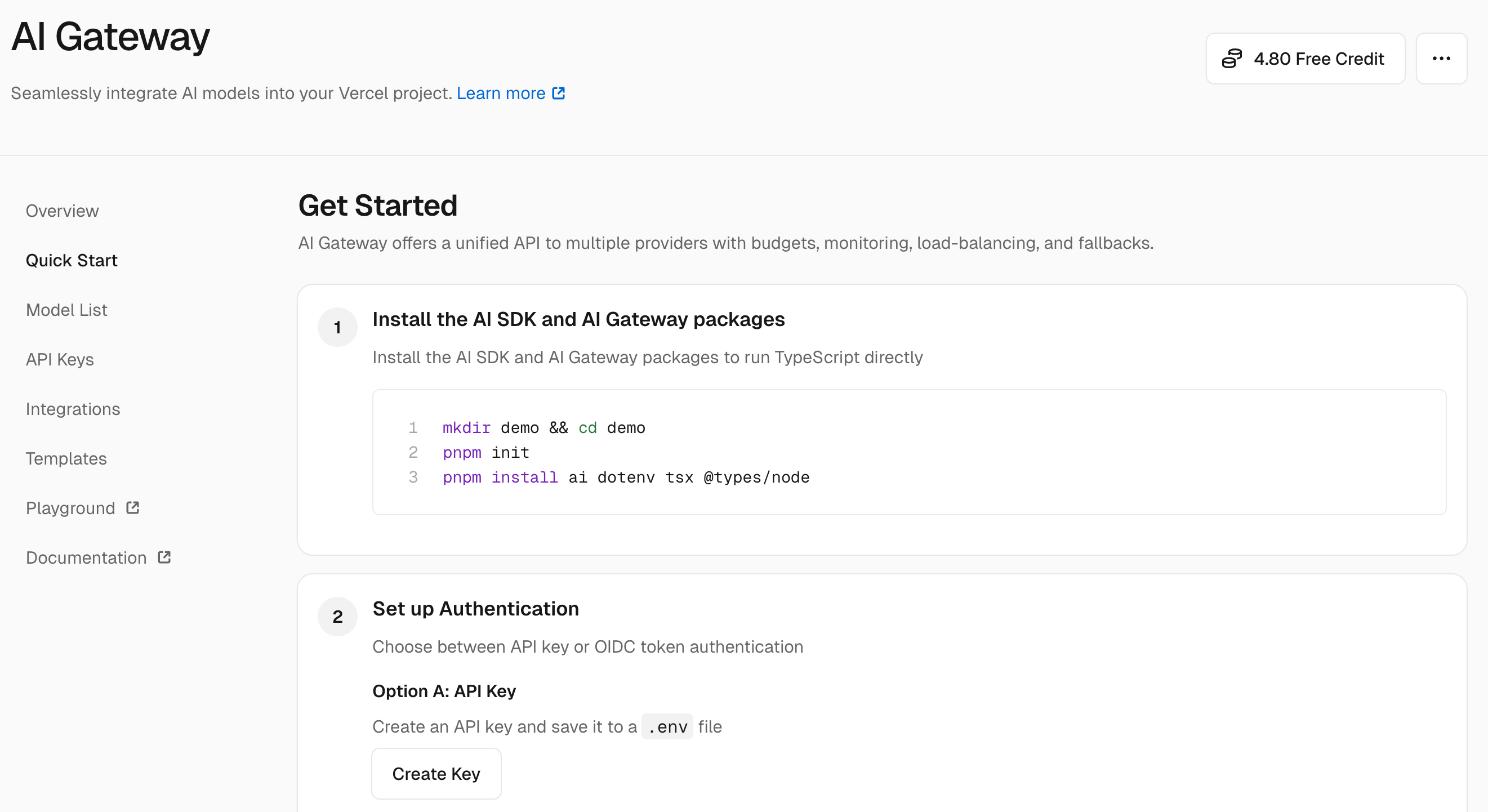 2. 使用 Vercel 的 AI Gateway 实现 AI 能力,需要先通过官方文档来获取尽可能多的用法:https://vercel.com/docs/ai-gateway/getting-started