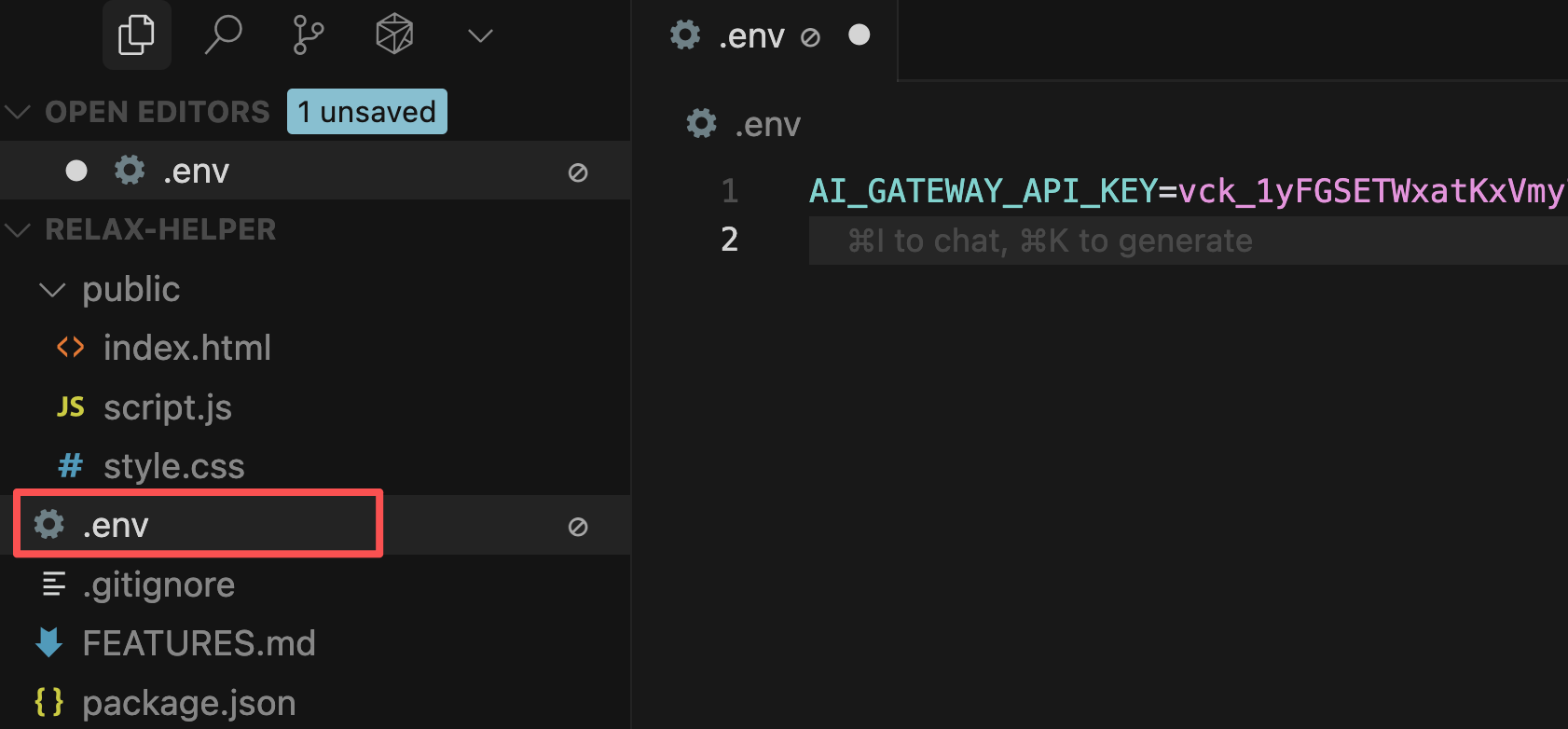 然后在根目录下创建 .env 环境变量配置文件,填入 AI Gateway 的 API Key: