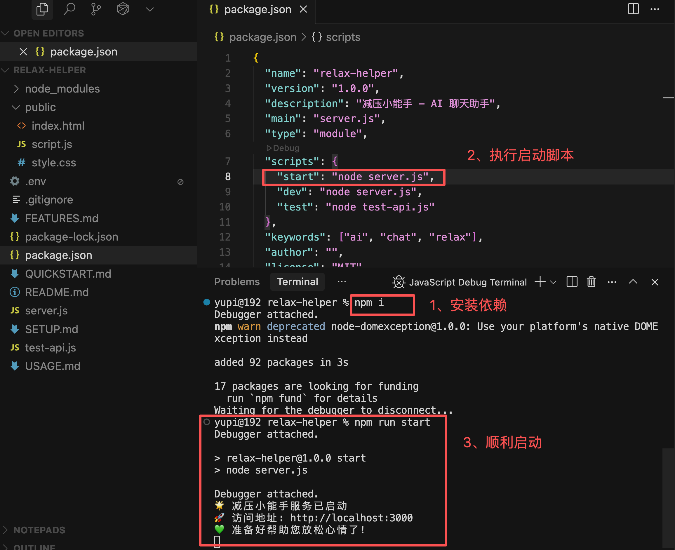 最后,安装依赖并执行启动脚本: