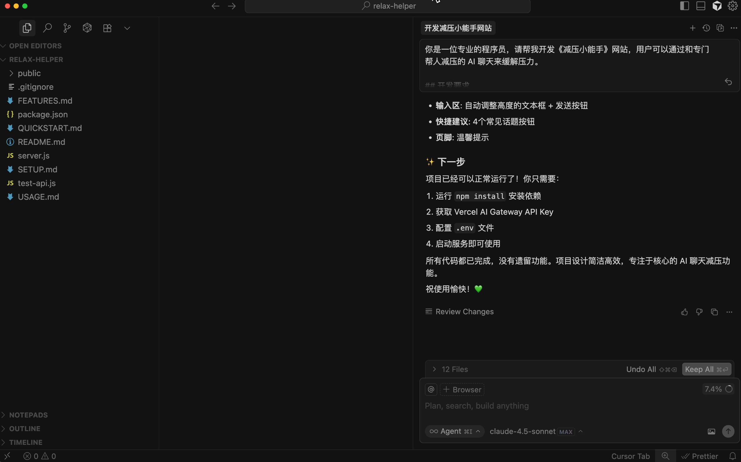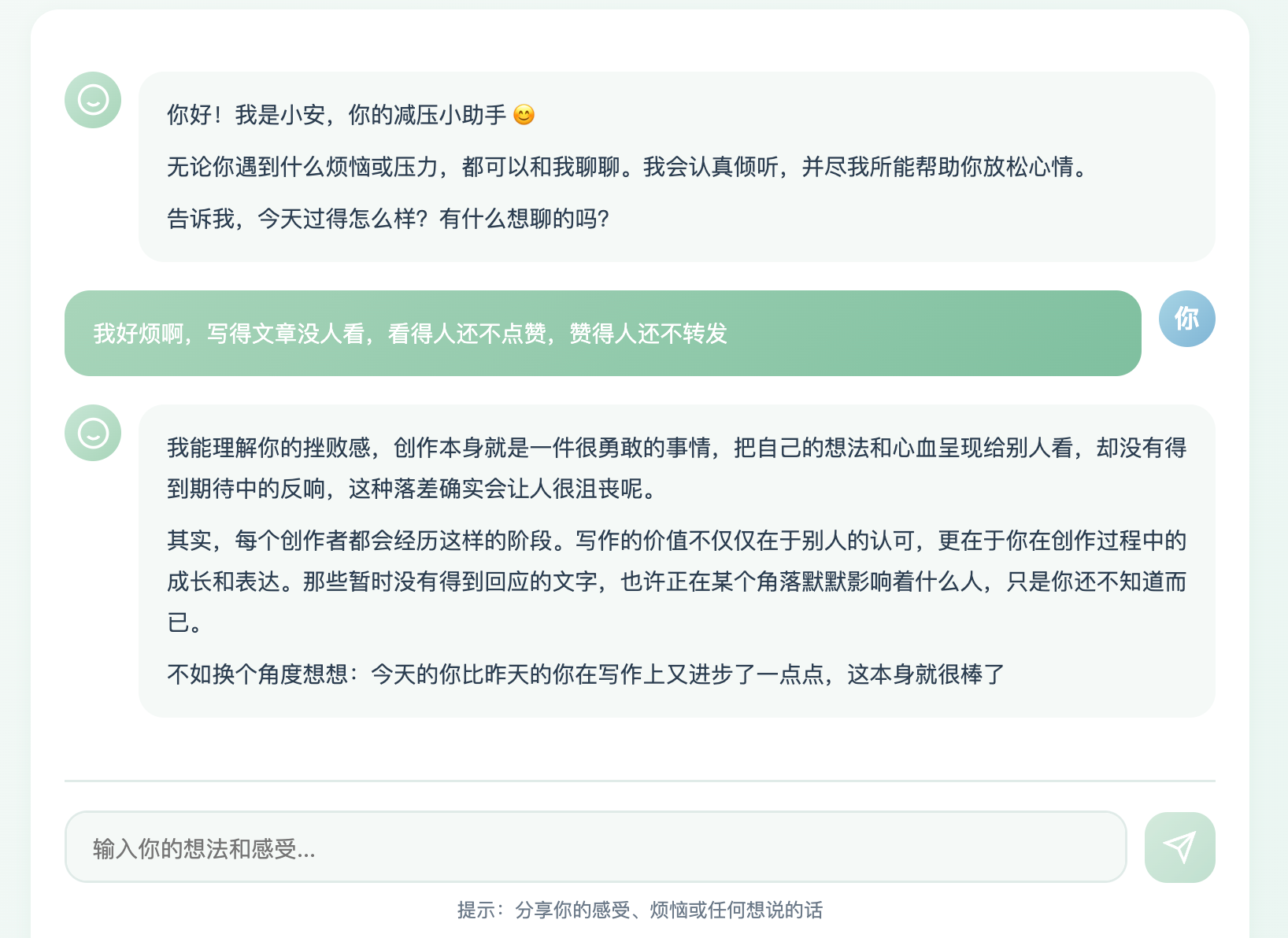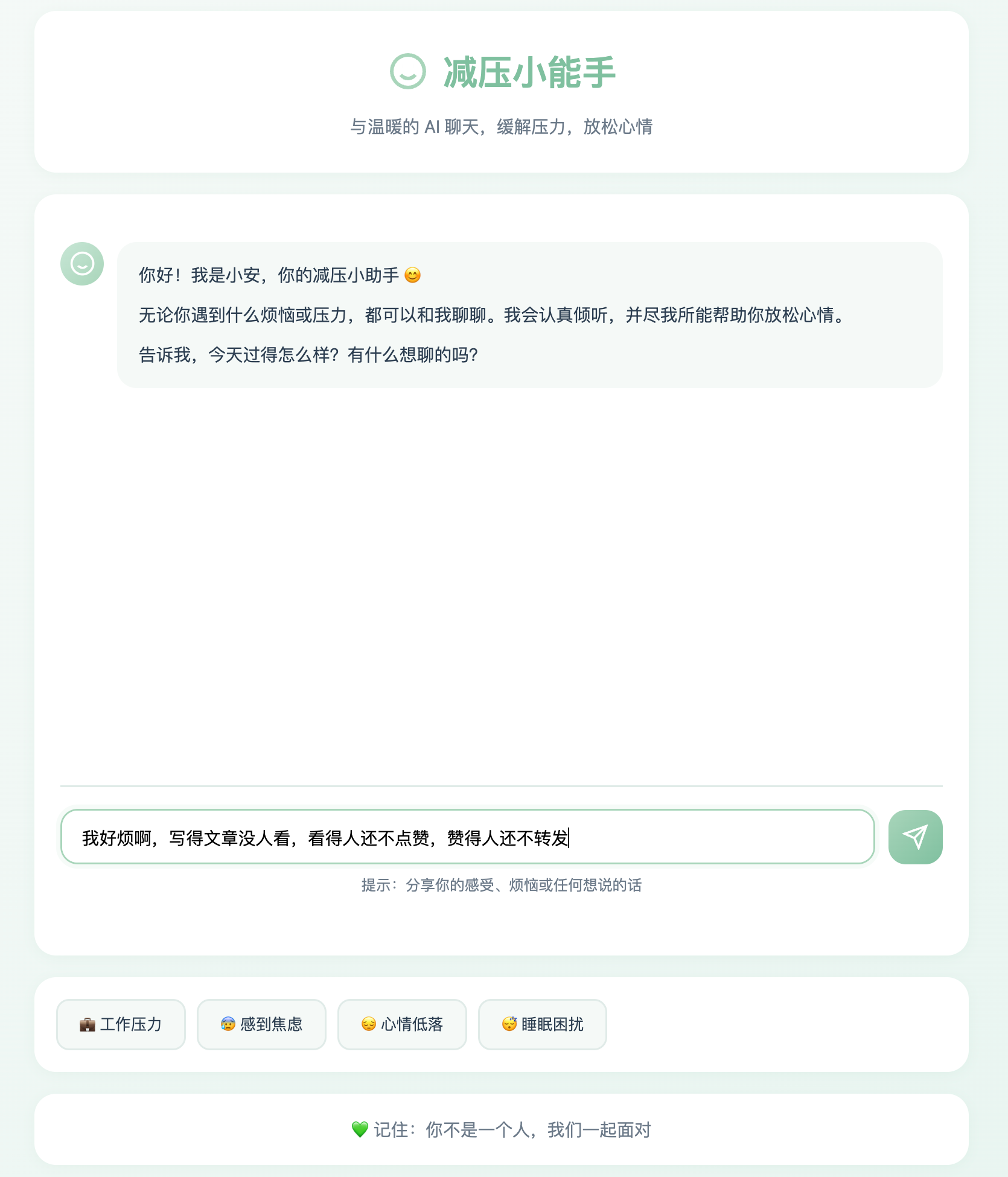 但是官方提供的 Demo 有点过于简单了,我们不妨利用 AI 来做一个《减压小能手》网站项目吧,让用户可以和专门帮人减压的 AI 聊天。