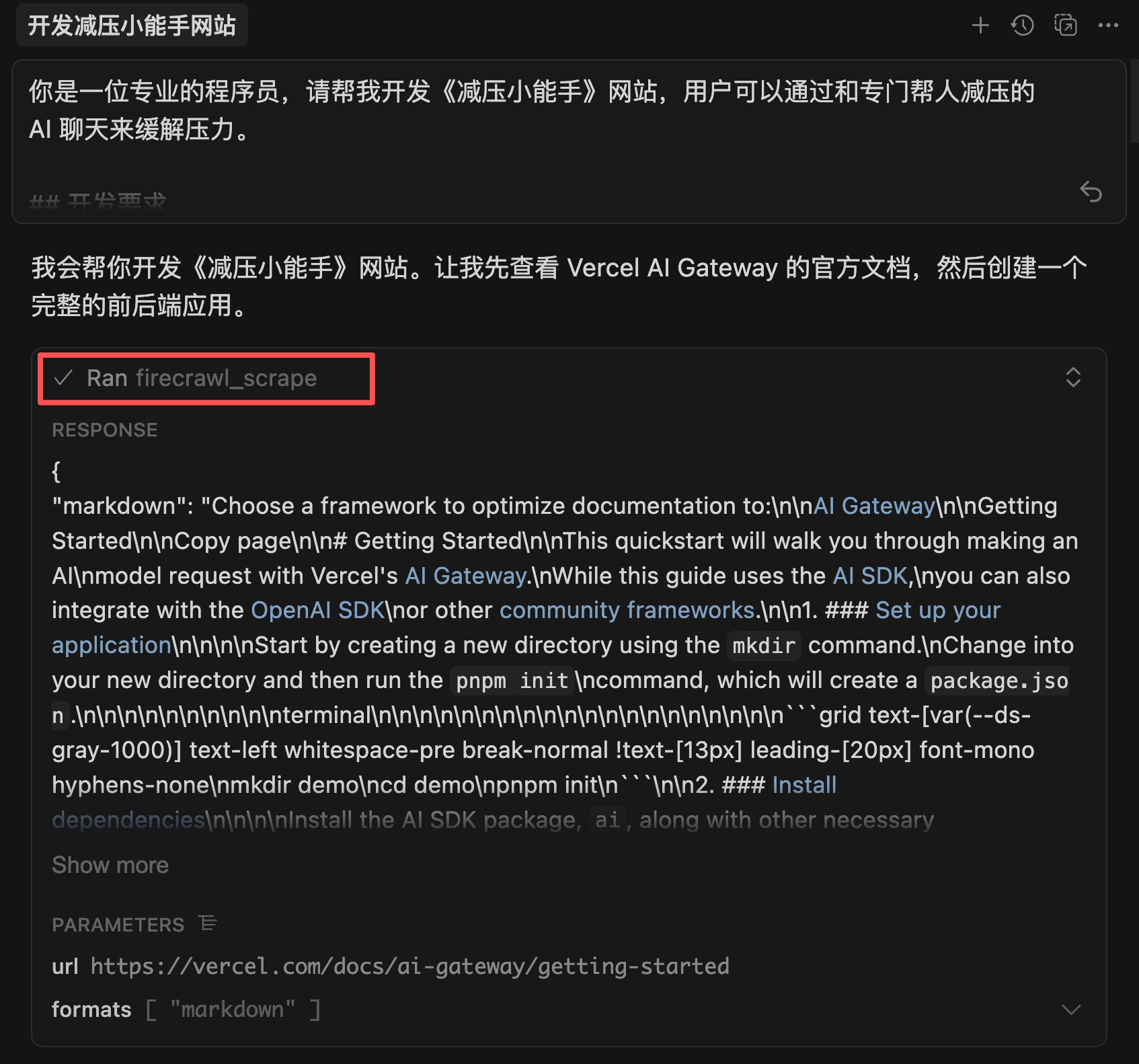 点击执行后,AI 会先调用 MCP 工具从网页中获取到信息,这里我用的是 Firecrawl MCP: