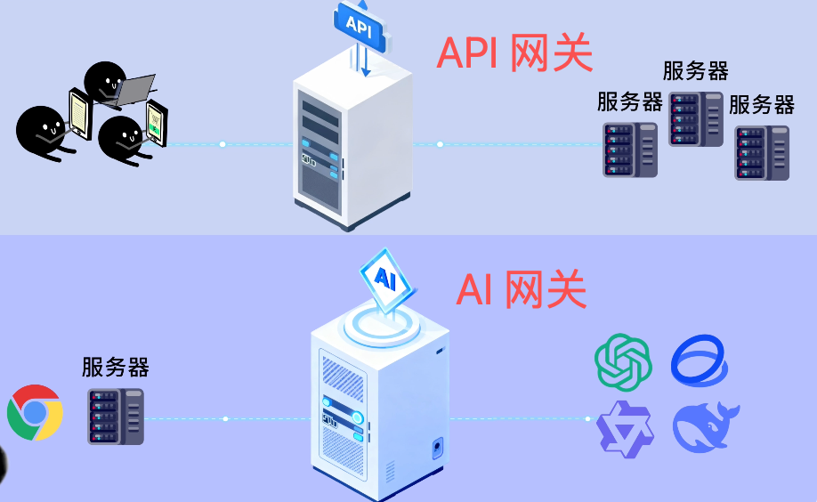 传统的 API 网关通常放在你的应用和各种后端服务之间;而 AI 网关是专门为 AI 应用设计的,放在你的应用和各种 AI 模型服务之间(比如 OpenAI、通义千问、DeepSeek 等等)。