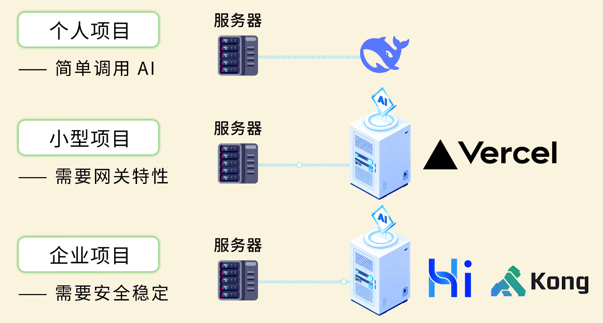 如果你的个人项目只需要简单地调用单个 AI 模型,直接调用 API 就够了;如果你个人或团队的小项目需要用到 AI 网关的特性(比如集成多个模型),那么可以选用 Vercel AI Gateway;而如果你要开发企业级应用,对安全性和稳定性要求很高,选用 Higress 或者 Kong 这种更专业的网关更合适,能帮你少写亿点点屎山代码 💩!