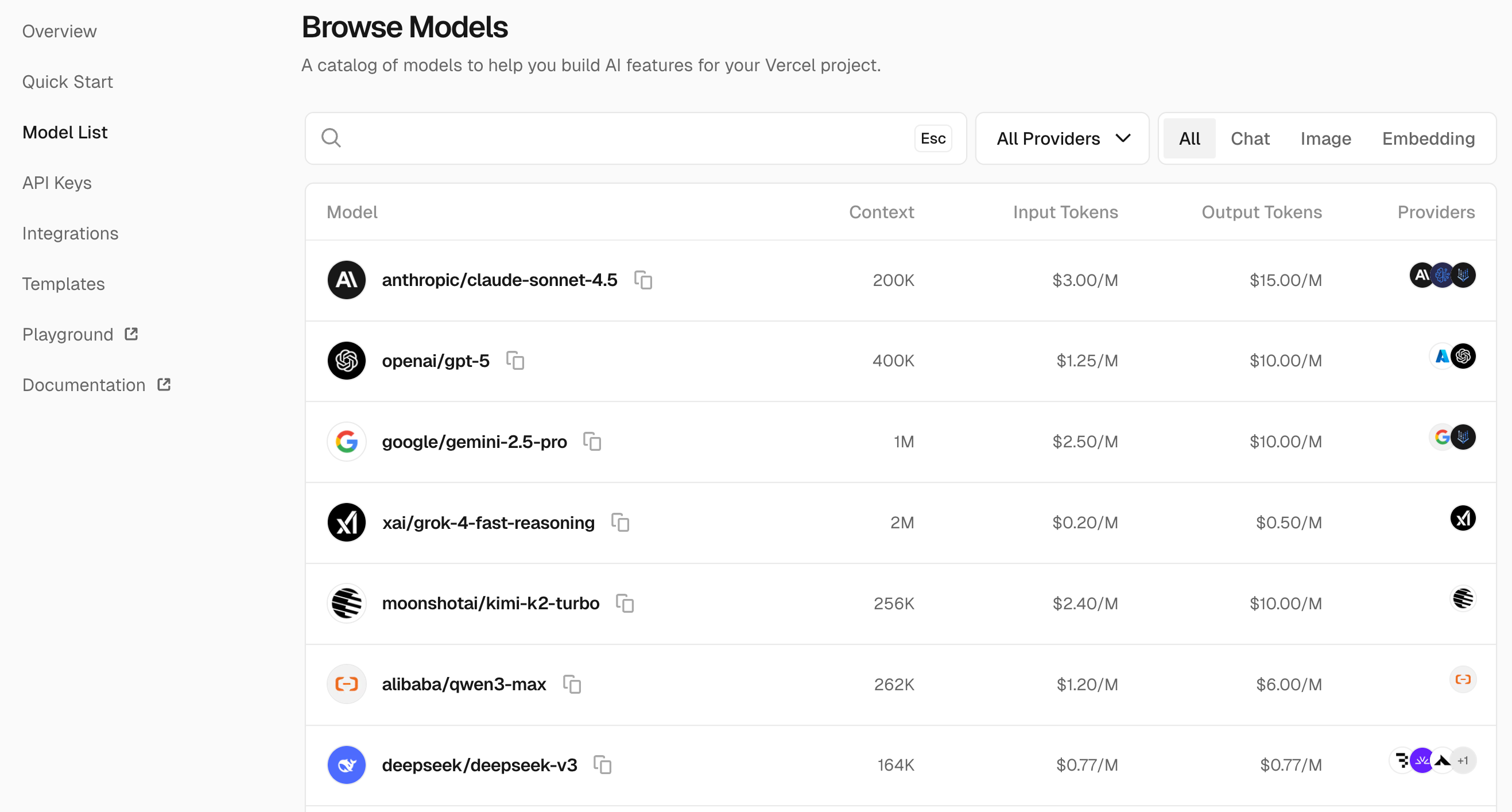 不仅如此,Vercel AI Gateway 支持非常多的国内外大模型,不同模型的计费标准都不一样:
