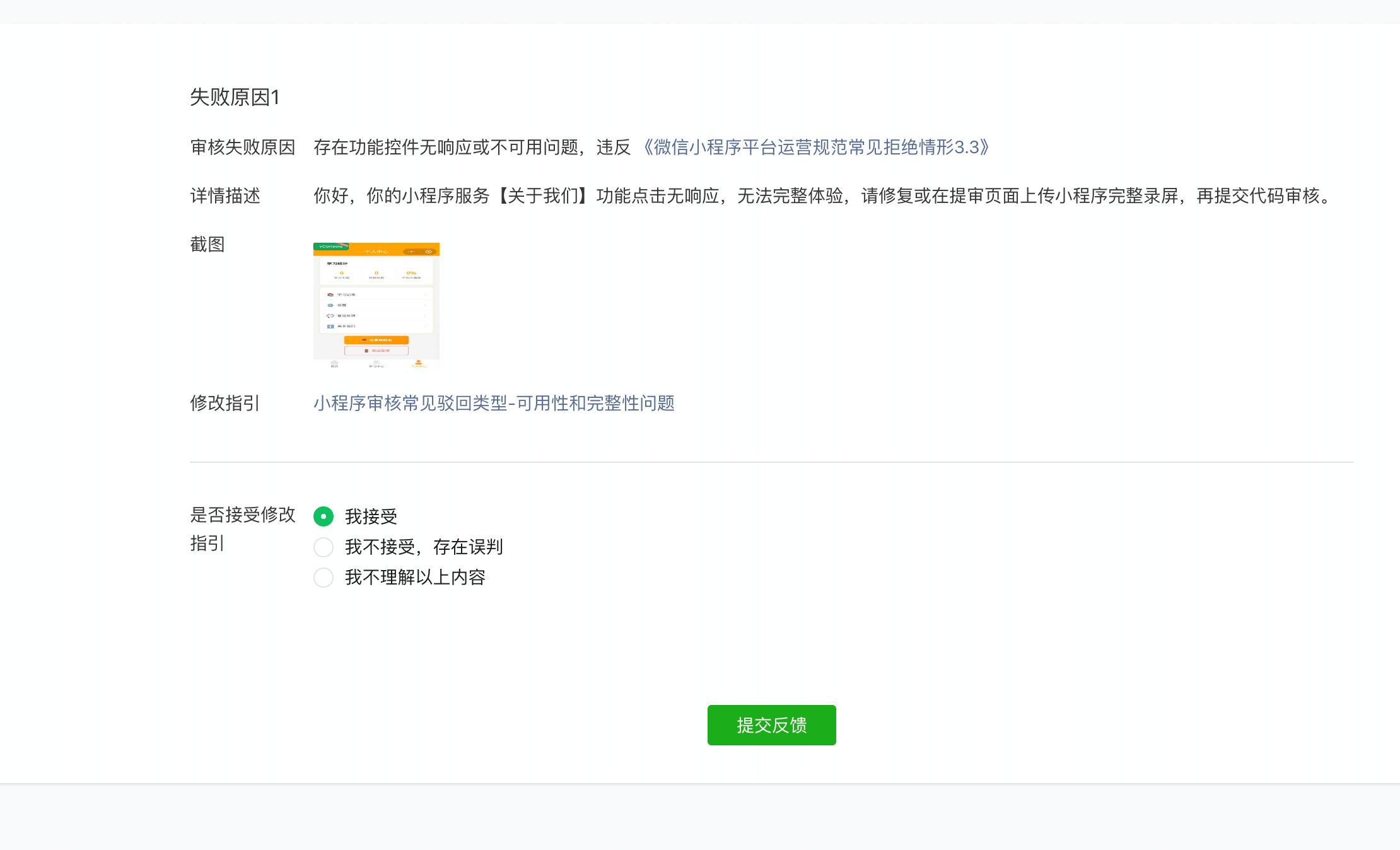 比如我遇到的这个情况,由于小程序的某个按钮点击后没有响应,就被打回来了。