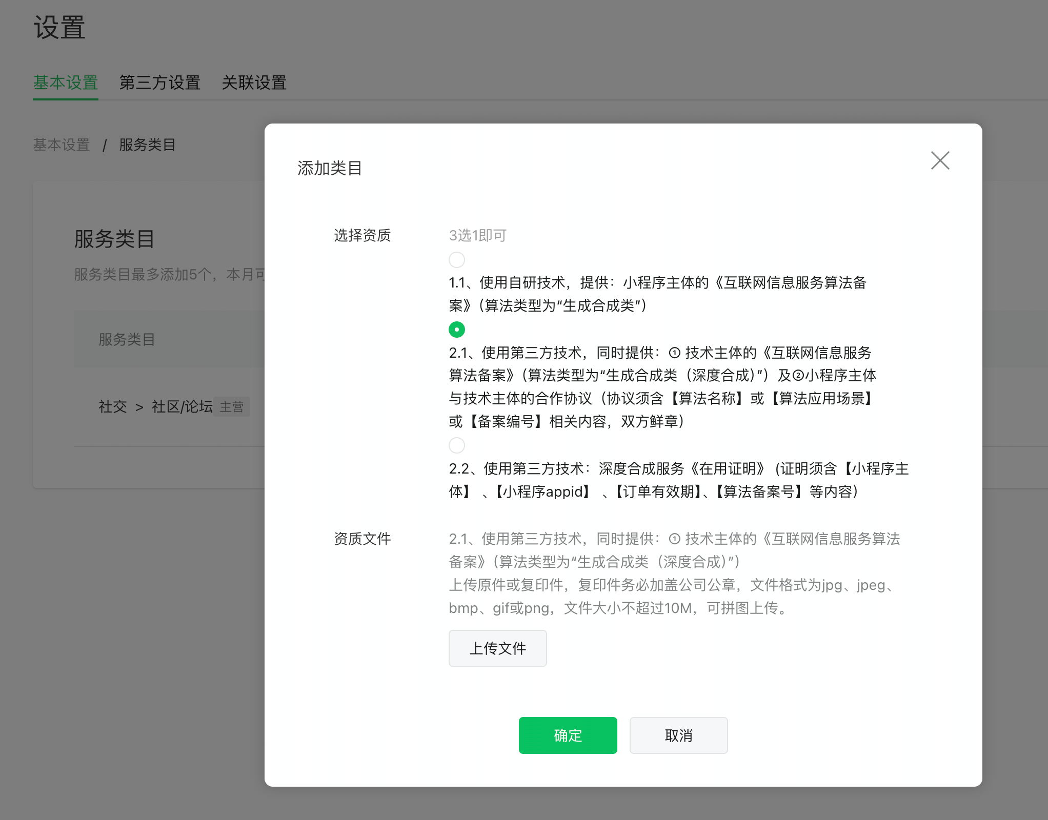 那我就按照修改指引添加类目呗,结果添加 AI 相关的类目是需要资质文件的!