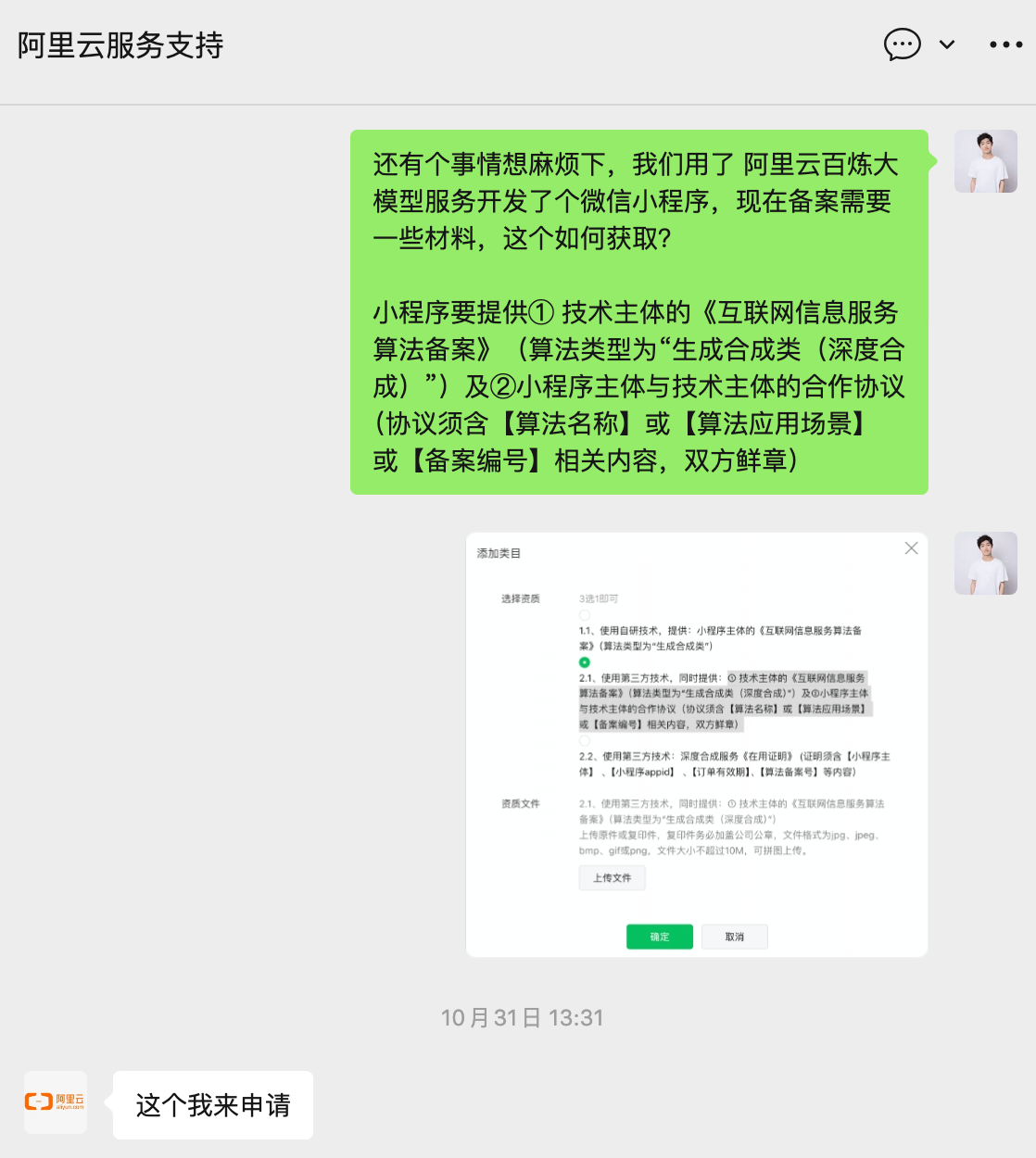 因为我用的是别人的大模型,需要有技术主体的《互联网信息服务算法备案》和《小程序主体与技术主体的合作协议》。。。