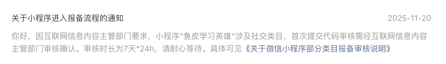 经过 2 ~ 3 天左右,代码审核终于通过了。然而由于我的小程序还涉及 “社交” 类目,需要进入第四步【小程序报备】。