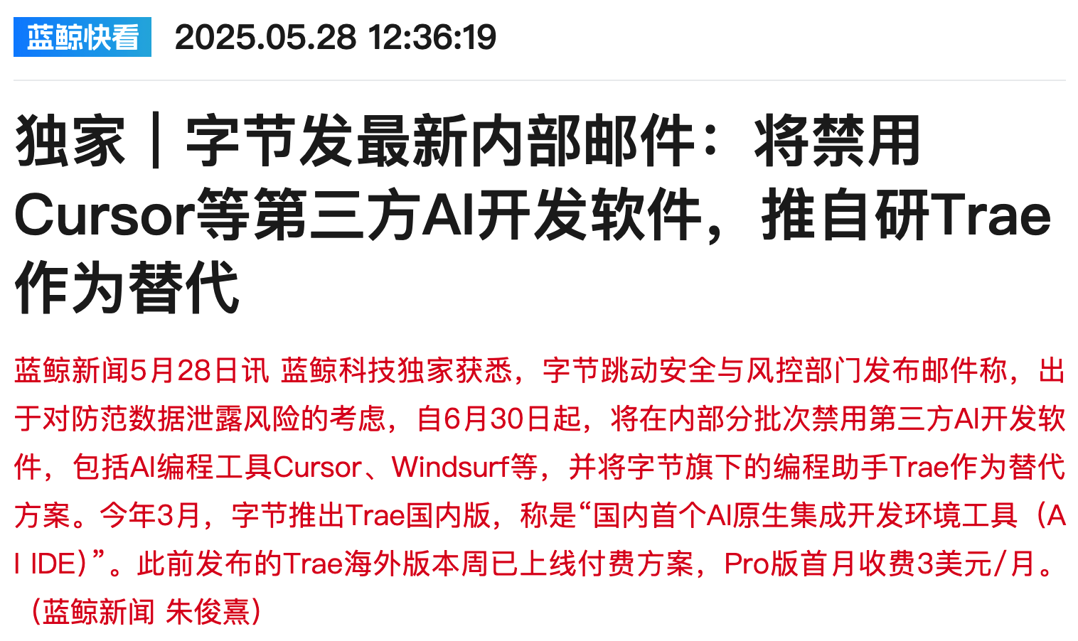 今年 5 月,字节跳动就发布了内部邮件:自 6 月 30 日起,将分批次禁用 Cursor、Windsurf 等第三方 AI 编程软件,转而推广自研的编程助手 Trae。