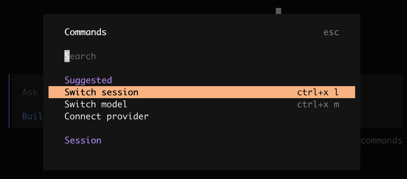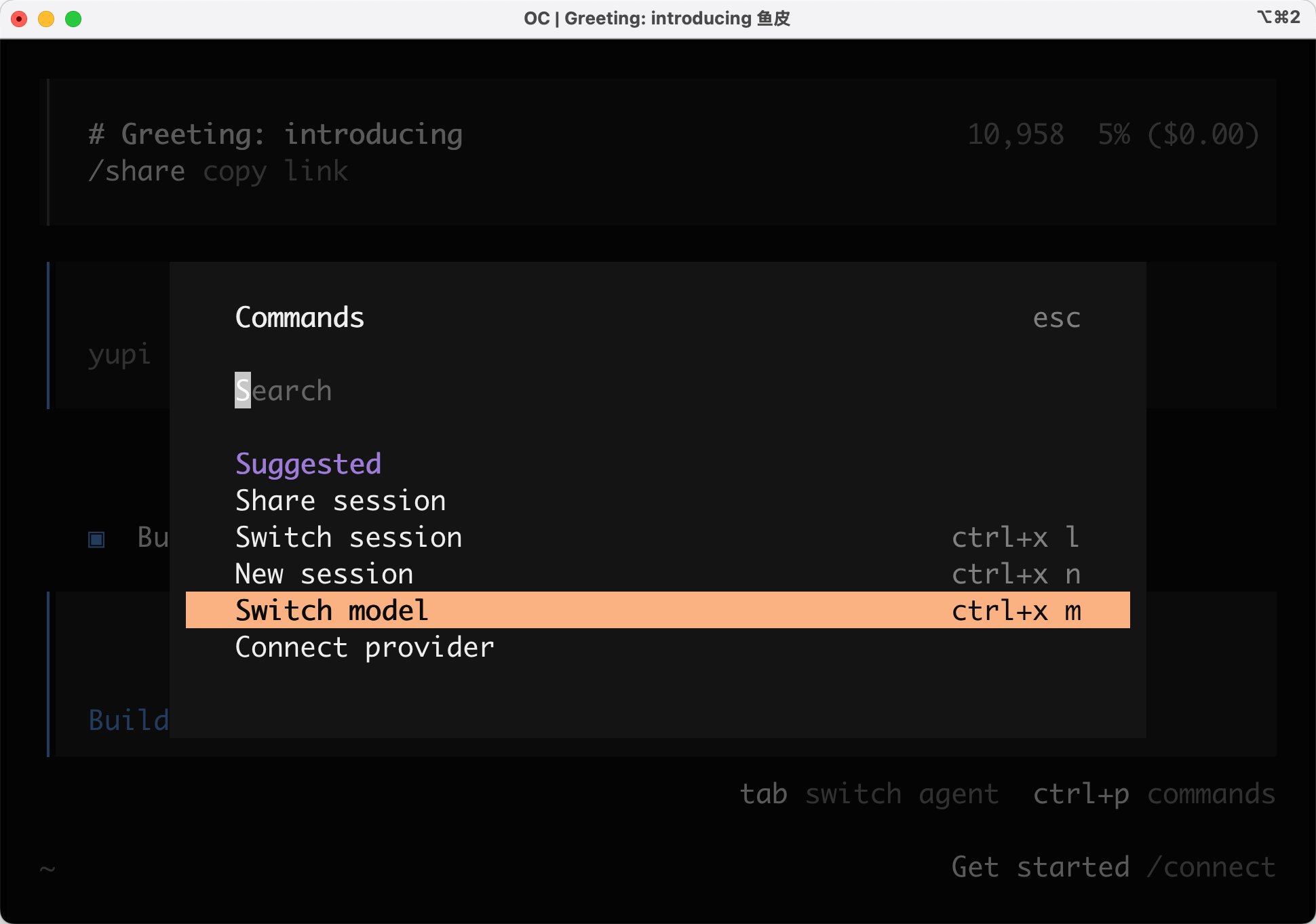 如果你不小心关闭了 OpenCode,不用担心,可以打开命令面板,选中 “Switch session” 切换会话: