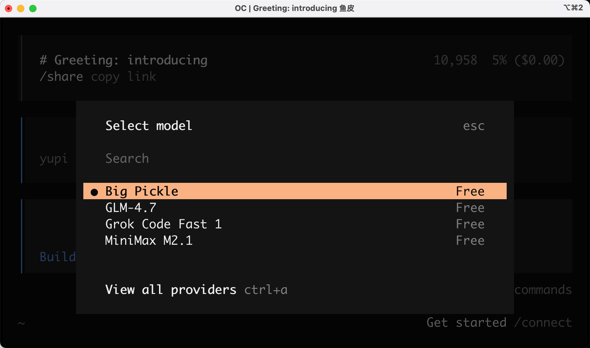 安装完成之后,输入 opencode 进入程序,接下来你就可以愉快地使用了~