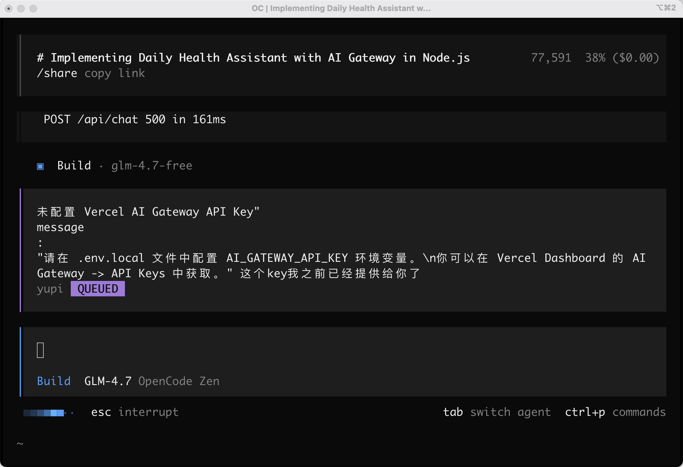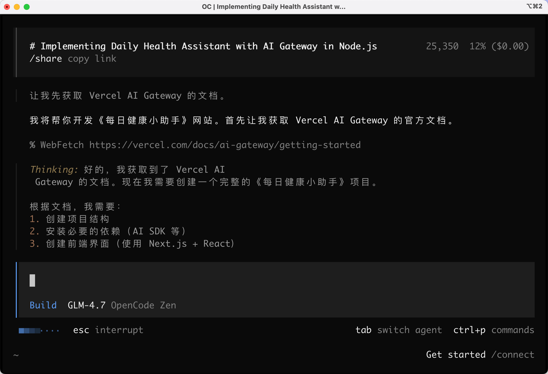 点击发送后,OpenCode 会自动使用网页抓取工具读取 Vercel AI Gateway 的官方文档,学习最新的用法: