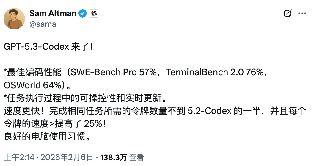 再看 OpenAI 这边。这次发布的 GPT-5.3-Codex,剑指 最强编程 Agent,而且不只是写代码,还能像你的同事一样边干活边和你沟通。