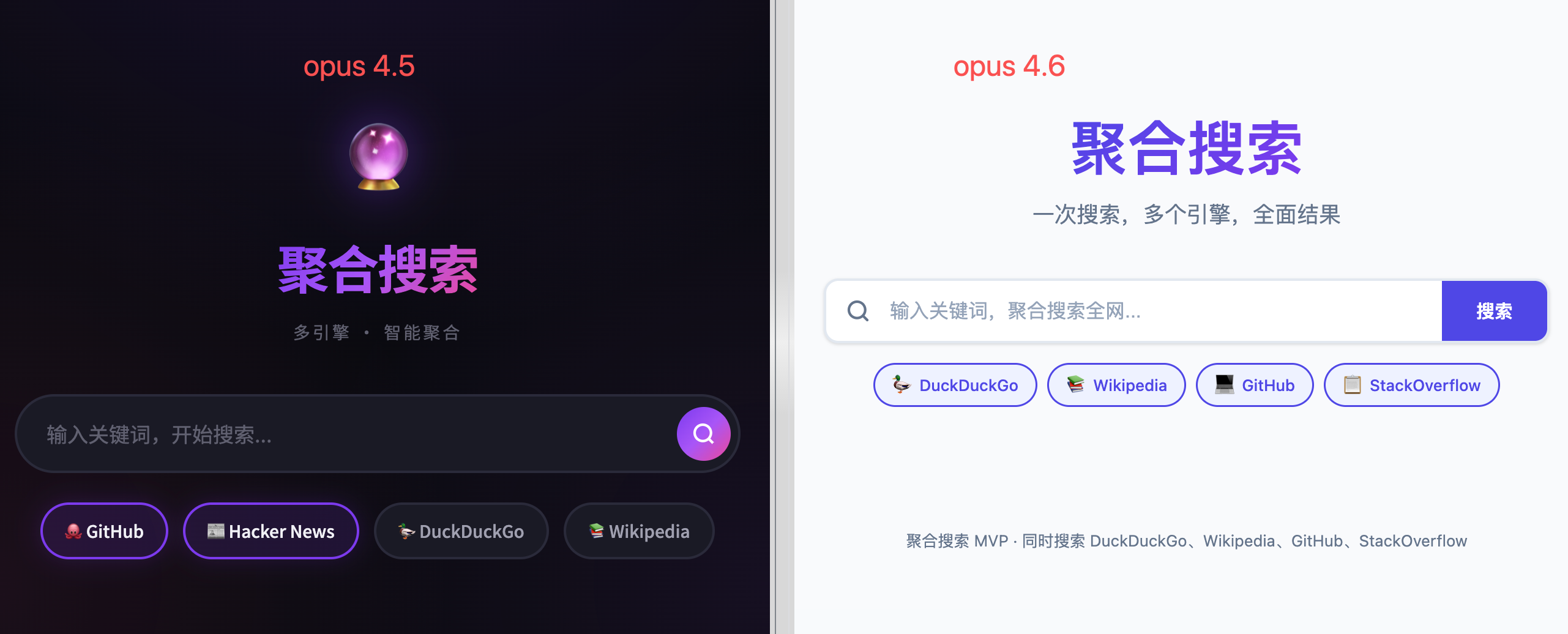 我实测了一波,让之前的 Opus 4.5 和新出的 Opus 4.6 同时开发一个「聚合搜索引擎」项目: