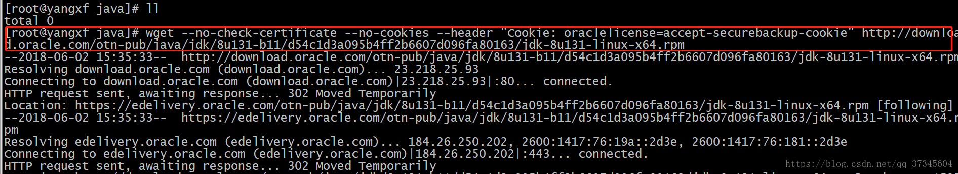 命令:wget --no-check-certificate --no-cookies --header "Cookie: oraclelicense=accept-securebackup-cookie" http://download.oracle.com/otn-pub/java/jdk/8u131-b11/d54c1d3a095b4ff2b6607d096fa80163/jdk-8u131-linux-x64.rpm
