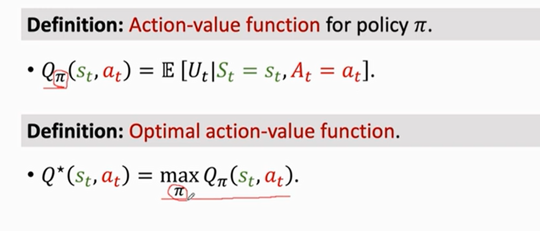 动作价值函数(Action-value function):QΠ,它跟策略函数(policy function)Π、状态s、动作a有关