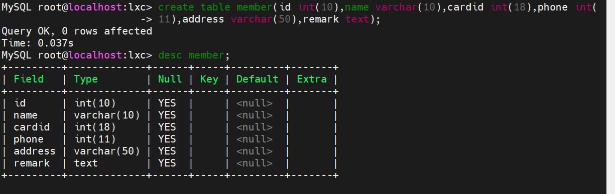 create table member(id int(10) ,name varchar(10) ,cardid int(18) ,phone int(11) ,address varchar(50),remark text);