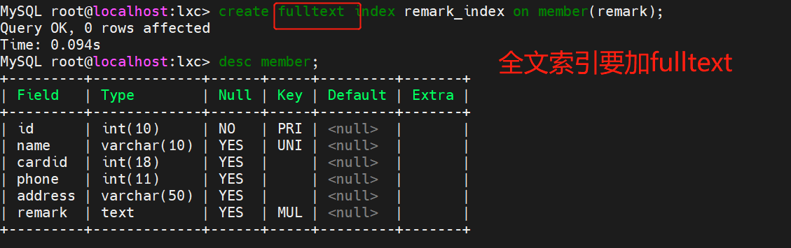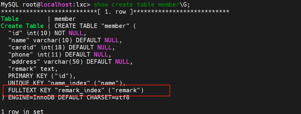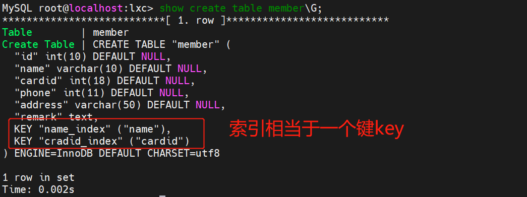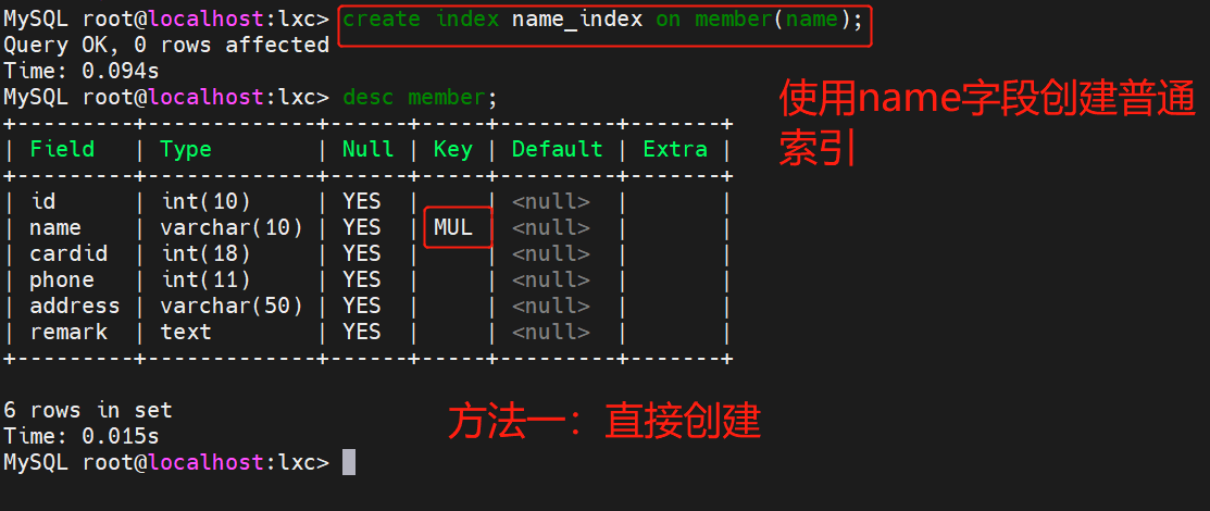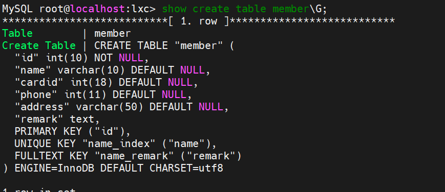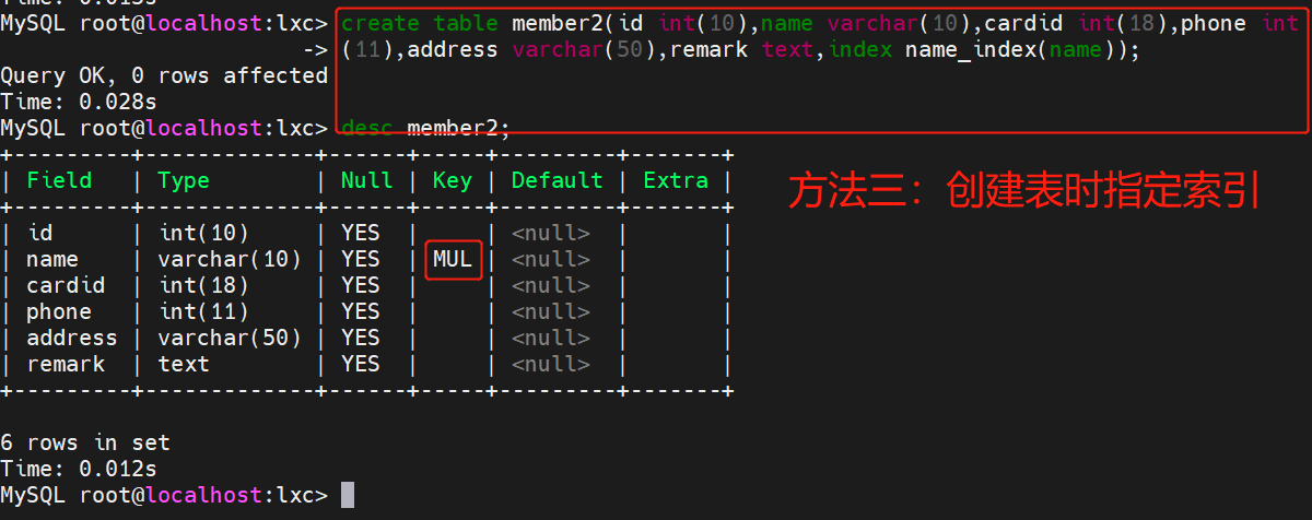create table member2(id int(10) ,name varchar(10) ,cardid int(18), phone int(11) ,address varchar(50),remark text,INDEX name_index(name));