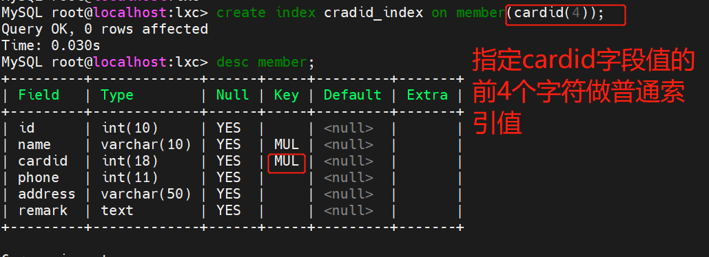 create index cardid_index on member(cardid(4)); #指定cardid字段值的前4个字符做普通索引的值