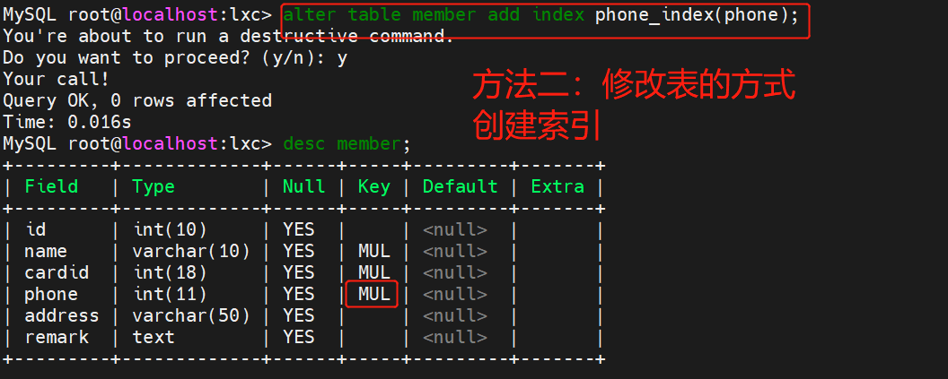 ALTER TABLE member ADD INDEX phone_index(phone); #以phone字段创建普通索引