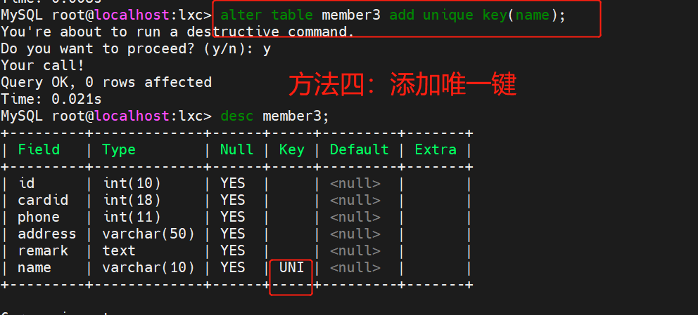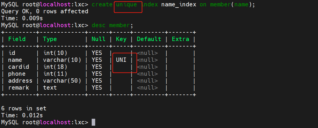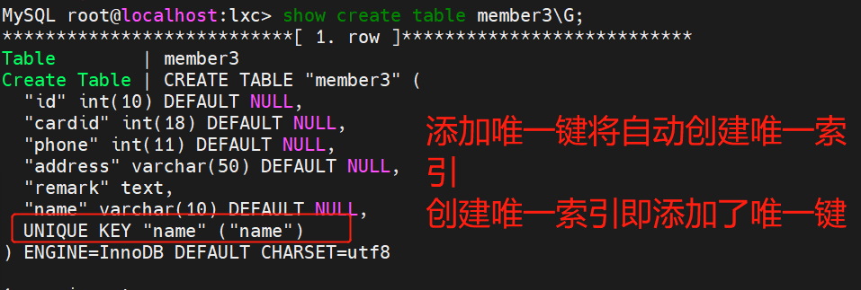 create table member3(id int(10) ,name varchar(10) ,cardid int(18) ,phone int(11) ,address varchar(50),remark text, unique phone_index(phone));