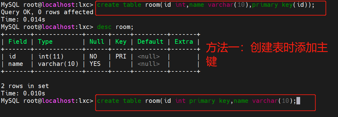 create table 表名(字段1 XXX primary key, ...); #将主键作为字段1的属性