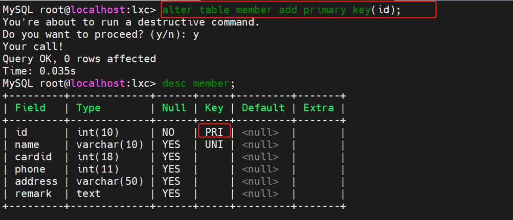 ALTER TABLE member add primary key(id); #将id字段添加为主键