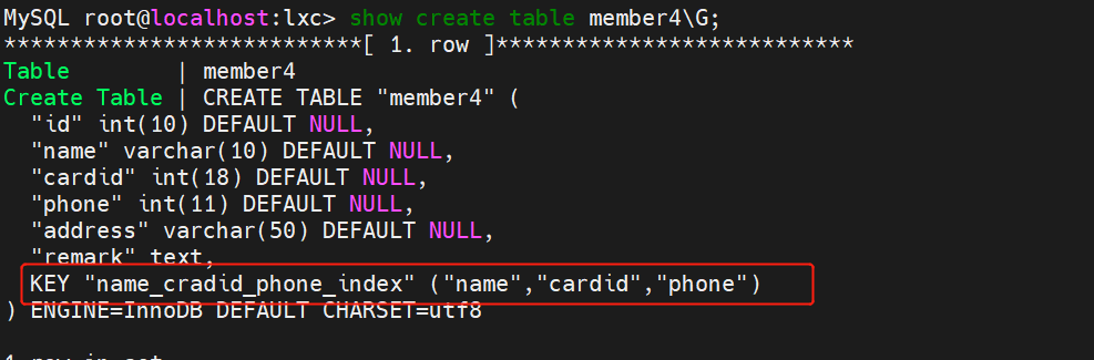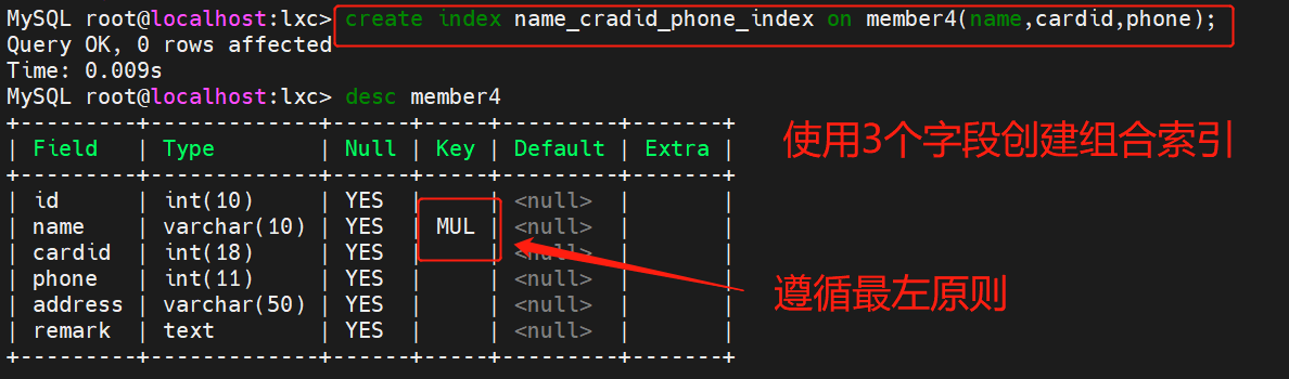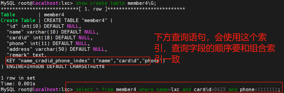 create index name_cardid_phone_index on member4(name,cardid,phone); #使用3个字段创建组合索引