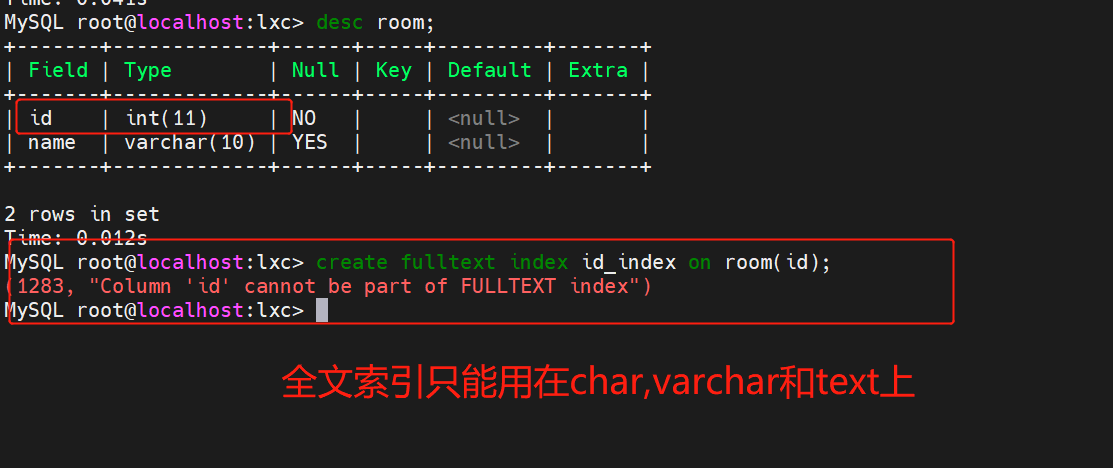 create table room4(id int(10),name varchar(10),fulltext name_index(name));