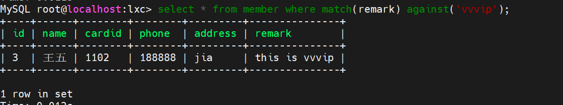 select * from member4 where cardid=1102 and name=王五 and phone=1588888888;