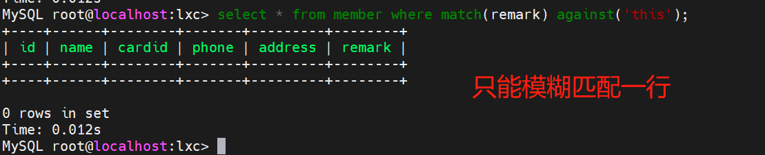 #这条语句查询不到匹配的记录,因为全文索引只能匹配完整的单词/字符串。