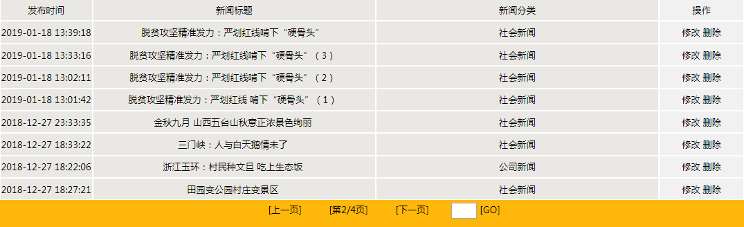 ajax异步分页后页面切换正常不会产生历史记录,使用H5方法history.pushState和history.replaceState生成历史记录,并修改地址栏,在地址后添加'/'和页码,页面标题改为'新闻管理-3'格式,3为页码;点击前进或后退可以回溯到浏览过的数据页面,点击刷新仍显示本页内容,效果如图;