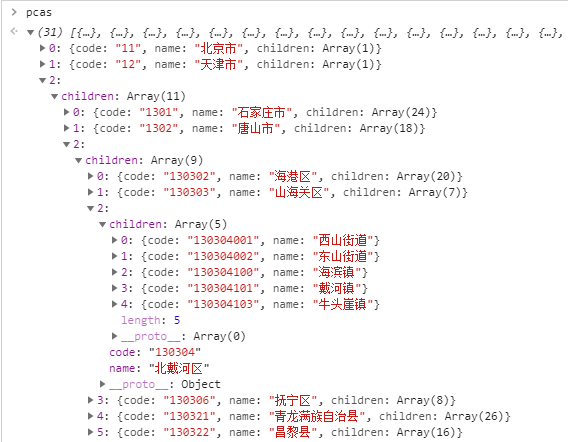 省、市、县、乡代码和名称列表在pcas-code.js文件,可以从网上下载,最新信息请看民政部网站;pcas-code.js定义一个json数组pcas,如图显示为河北省秦皇岛市北戴河区海滨镇;