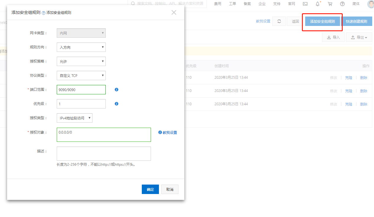 如果我们用的是云服务器,那么我们要先在安全组策略中把9090端口开放,因为在yapi搭建的最后又可视化操作时使用的端口就是9090,我的是阿里云的服务器,配置安全组相信大部分人都会,但是本着细致的精神就简单说一下