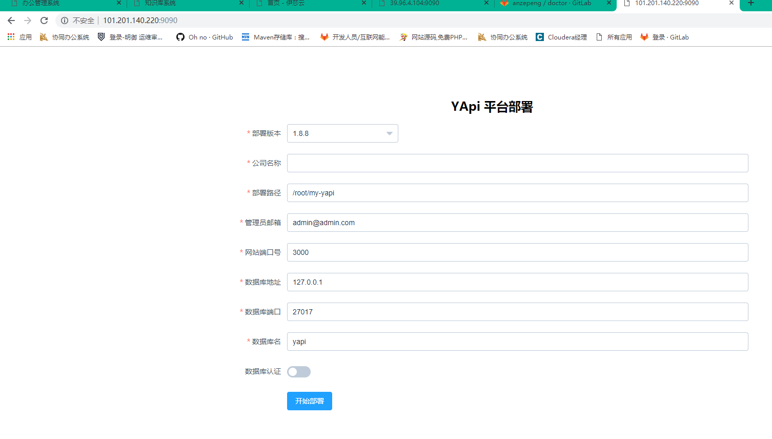 填写公司名称后点击开始部署就会自动部署,如果没报错恭喜你顺利安装,我在这就又遇到了初始化数据库mongdb的错误