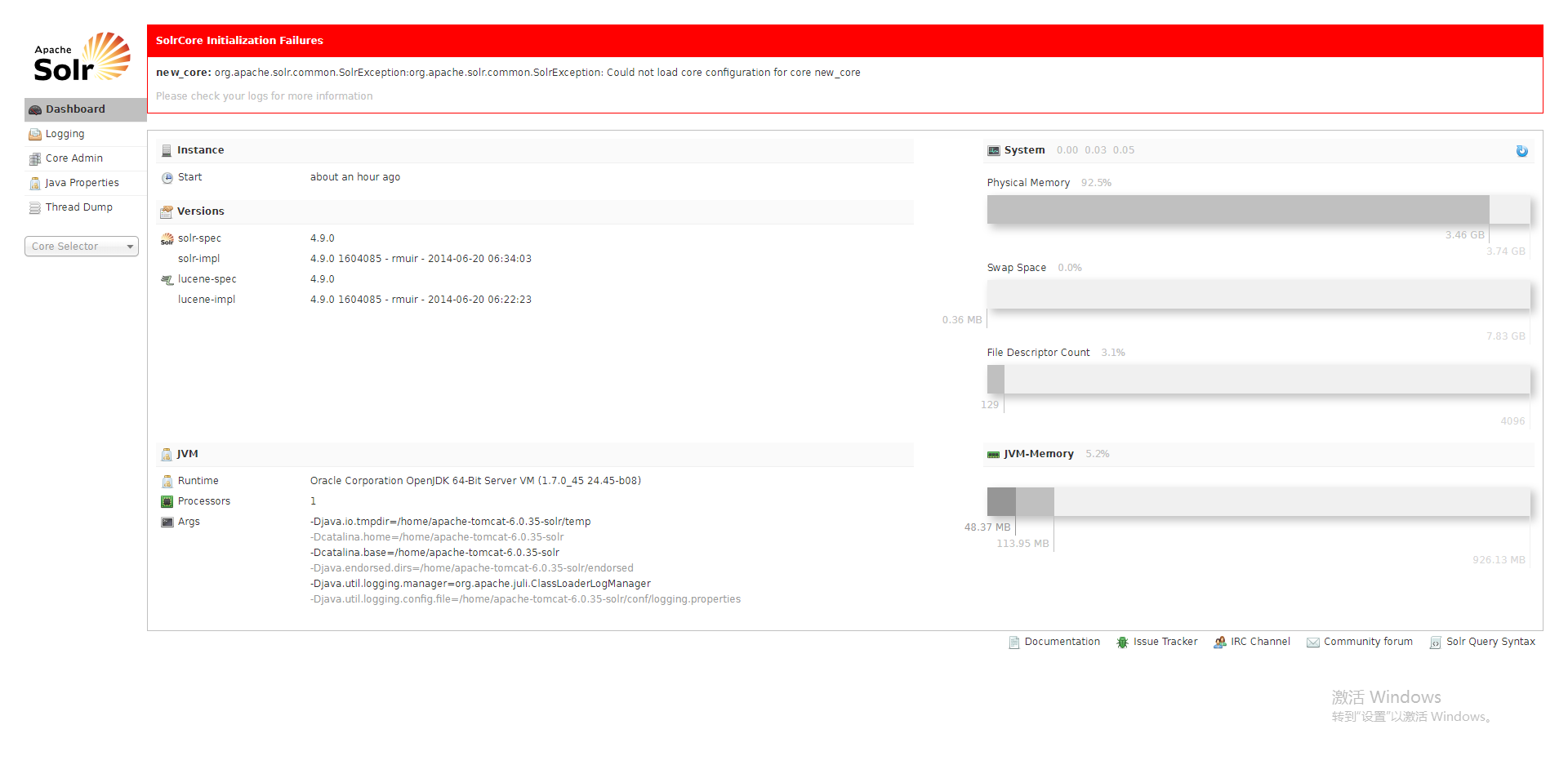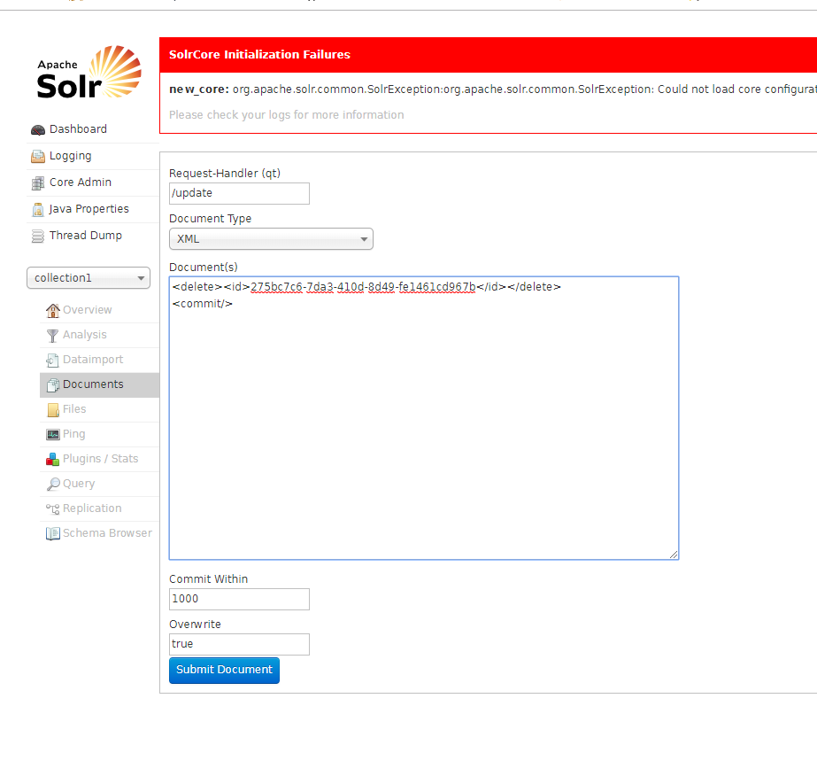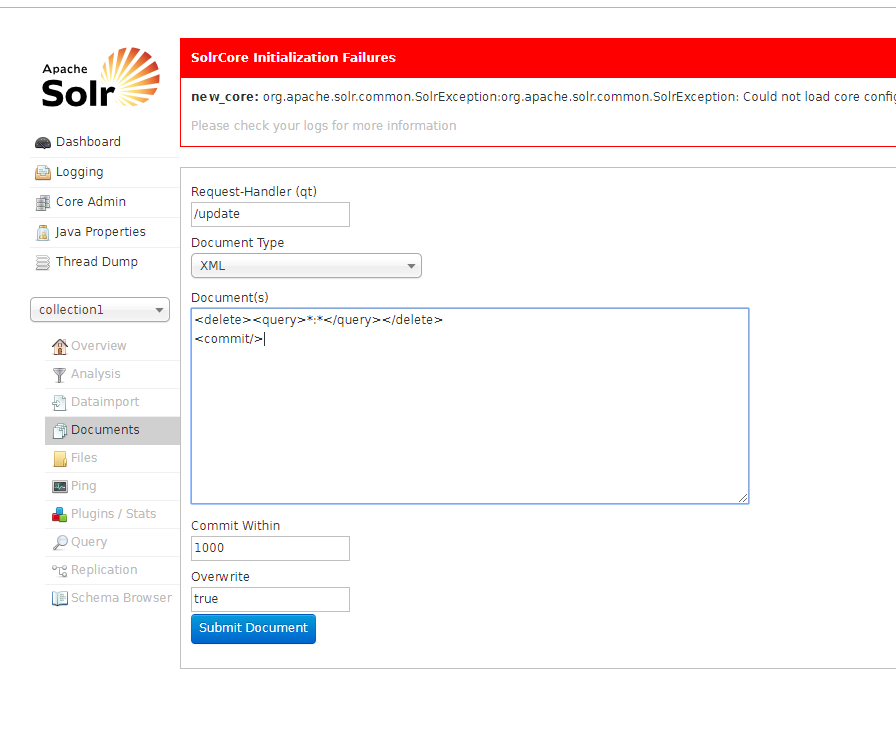 如图我先去solr里看了一下服务,没发现有什么异常,随后脑残的我就执行了删除索引命令
