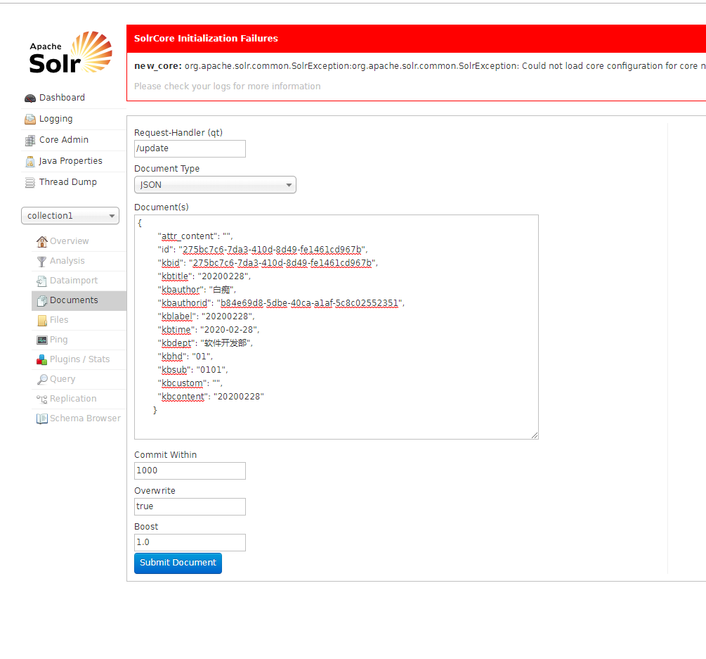 因为solr索引的数据是有依可循的,还好我们还可以操作添加,于是我提交了一篇文章,我到solr里看它的格式,它的格式是一个json(如果小伙伴们想直接操作solr可以执行把json打到Documents的json框里就可以新增了)大概是这样的:
